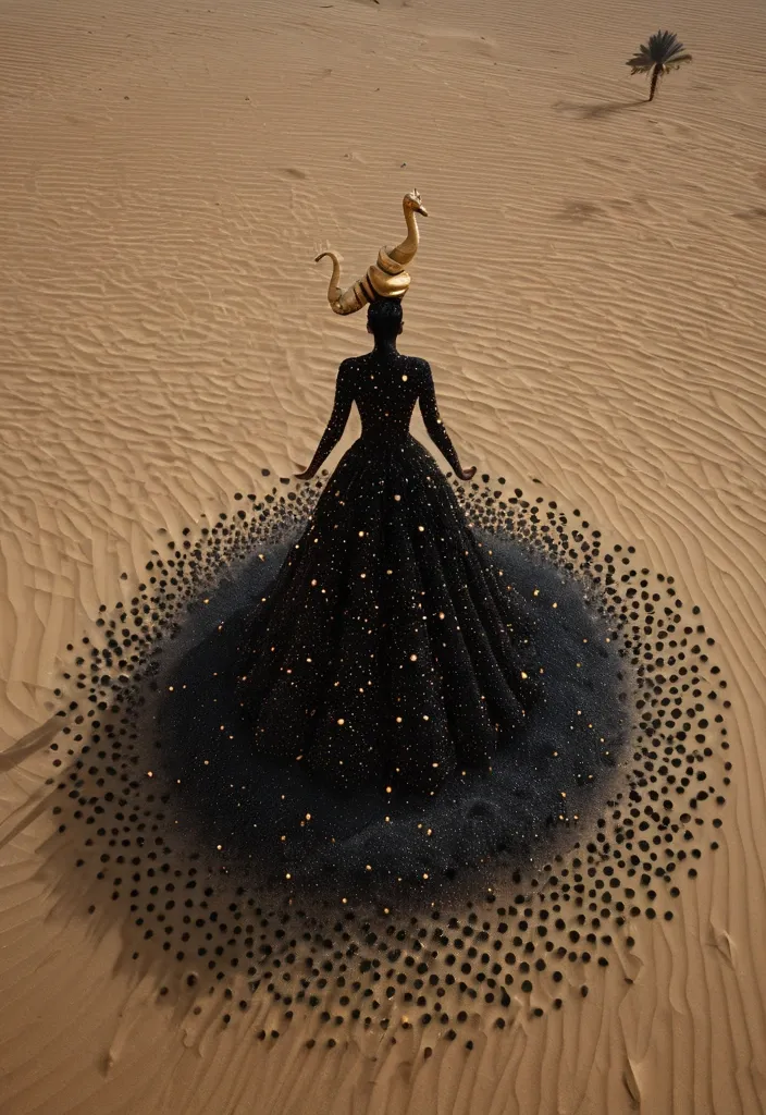 Aerial view , top-down view. A surreal , Date Palm trees spirals like a vortex towered sky , comprising dark black , warm gray , and deep white particles that dissolve into the dark sky. A female figure riding on camel , rendered in golden dots that reflect calmness , she in a gown of red and gray particles that similarly fade into the darkness. The structure and gown emerged into the foreground , set against an desert sand backdrop. ,