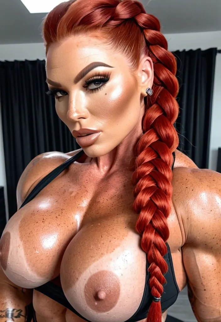 Generate Gorgeous female boss , bimbo , hourglass body , abnormally massive female bodybuilder , gorgeous , close up , full lips , big booty , redheaded , freckles on face and breast , braided design hair , feminine silhouette , too big breast , big booty , sexy thighs abs , silhouette , up close , flexing biceps , beautiful green eyes , legs are iconic and defining physical feature , both visually and in terms of combat ability.wearing an outfit that is a striking blend of elegance , power , and femininity , designed to command attention in any room. The suit is tailored to perfection , hugging the wearer’s curves with precision while emphasizing a structured silhouette. The fabric itself is a refined grey tweed patterned with subtle white grid lines , giving the suit a texture that feels both sophisticated and modern. The blazer features broad blue lapels and gold button accents , adding a luxurious touch that elevates the look beyond typical business attire. The matching high-waisted trousers elongate the frame , further enhancing the poised and commanding effect of the ensemble.The styling choices amplify the boldness of the suit. The inner blouse is a silky , greybutton-down shirt that complements the tweed’s tone while introducing a softer , feminine balance to the sharp tailoring of the jacket. The blouse peeks out neatly from under the blazer , maintaining elegance without drawing focus away from the suit’s commanding cut. Accessories are kept minimal yet intentional: a delicate layered gold necklace and hoop earrings that add glimmers of light and luxury without overpowering the outfit. The choice of voluminous , honey-brown braids cascading down her shoulders frames the face with both confidence and glamour , completing the commanding visual.Altogether , this look communicates a blend of authority and allure. It is business-ready yet fashion-forward , balancing corporate structure with vibrant femininity. The color palette blue , grey and gold avoids being overly delicate , instead embracing the richness of texture , structure , and presence. This is the kind of ensemble that speaks to ambition , sophistication , and personal style—ideal for someone who thrives in positions of influence but insists on expressing her individuality with bold elegance. It’s not just clothing—it’s a statement of power wrapped in grace. In luxury living legs that could crush a watermelon , skirt high boots are a bold and striking statement piece , crafted in glossy black patent leather that gives them a sleek , polished finish. Rising to just below the knee , the boots feature three adjustable buckle straps along the shaft , adding both edge and detail to their design. The towering stiletto heel , paired with a thick platform sole , creates an ultra-dramatic silhouette that elongates the leg and exudes power and confidence. With their combination of shine , height , and structure , these boots perfectly balance fierce femininity with high-fashion allure. Enormous breast ,