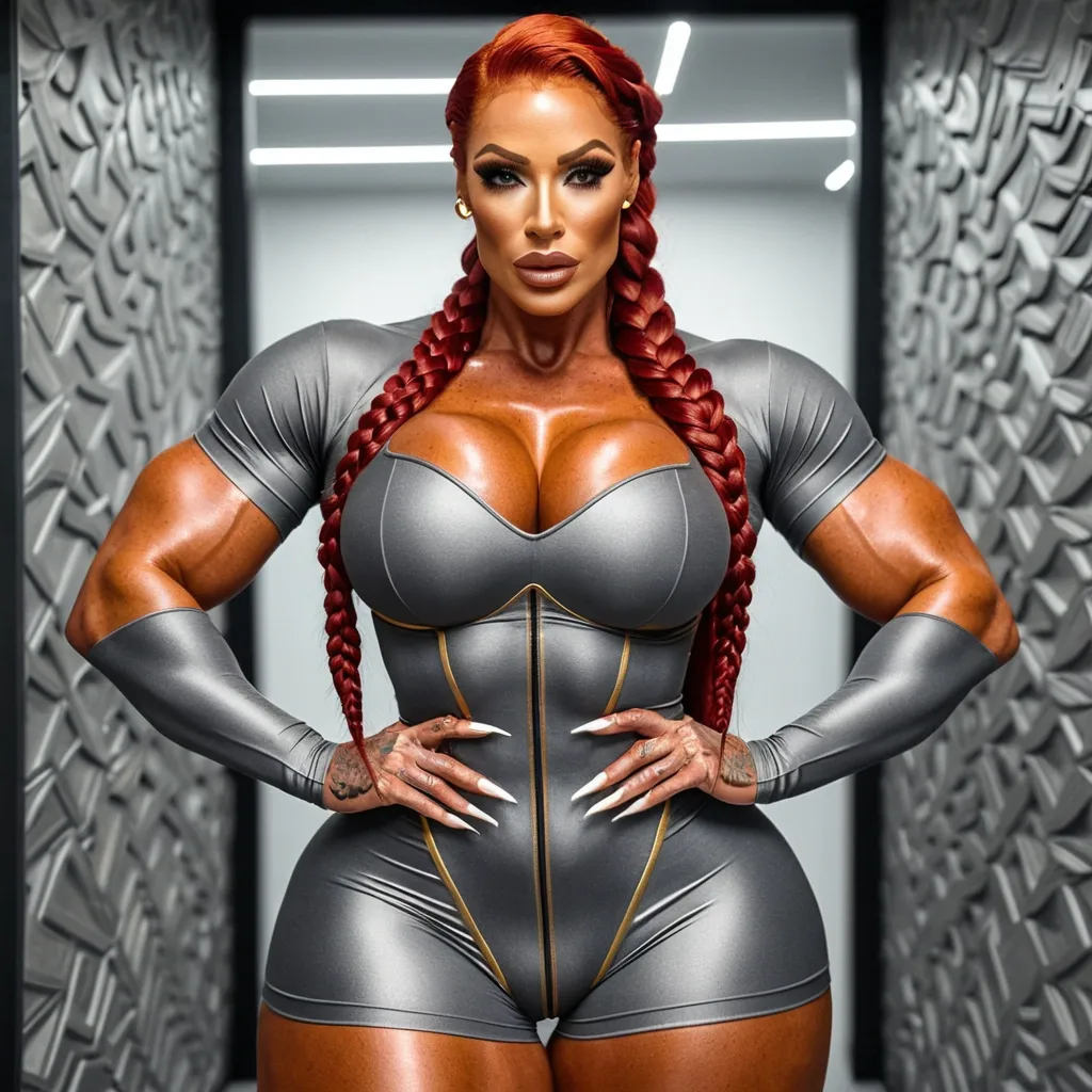 Generate Gorgeous female boss , bimbo , hourglass body , abnormally massive female bodybuilder , gorgeous , close up , full lips , big booty , redheaded , freckles on face and breast , braided design hair , feminine silhouette , too big breast , big booty , sexy thighs abs , silhouette , up close , flexing biceps , beautiful green eyes , legs are iconic and defining physical feature , both visually and in terms of combat ability.wearing an outfit that is a striking blend of elegance , power , and femininity , designed to command attention in any room. The suit is tailored to perfection , hugging the wearer’s curves with precision while emphasizing a structured silhouette. The fabric itself is a refined grey tweed patterned with subtle white grid lines , giving the suit a texture that feels both sophisticated and modern. The blazer features broad blue lapels and gold button accents , adding a luxurious touch that elevates the look beyond typical business attire. The matching high-waisted trousers elongate the frame , further enhancing the poised and commanding effect of the ensemble.The styling choices amplify the boldness of the suit. The inner blouse is a silky , greybutton-down shirt that complements the tweed’s tone while introducing a softer , feminine balance to the sharp tailoring of the jacket. The blouse peeks out neatly from under the blazer , maintaining elegance without drawing focus away from the suit’s commanding cut. Accessories are kept minimal yet intentional: a delicate layered gold necklace and hoop earrings that add glimmers of light and luxury without overpowering the outfit. The choice of voluminous , honey-brown braids cascading down her shoulders frames the face with both confidence and glamour , completing the commanding visual.Altogether , this look communicates a blend of authority and allure. It is business-ready yet fashion-forward , balancing corporate structure with vibrant femininity. The color palette , gray , and gold avoids being overly delicate , instead embracing the richness of texture , structure , and presence. This is the kind of ensemble that speaks to ambition , sophistication , and personal style—ideal for someone who thrives in positions of influence but insists on expressing her individuality with bold elegance. It’s not just clothing—it’s a statement of power wrapped in grace. Gray and gold , t-shirt blouse. Stacked hourglass silhouette ,