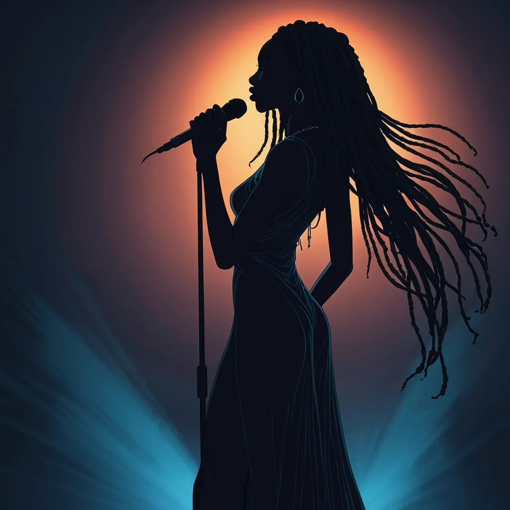 Art Style: Artstation , Illustration , Graphic Novel Visual Description: Silhouetted figure of a blues singer against a vibrant , smoky background; standing in a spotlight; long dark dreadlocks cascading down her back; microphone held close; esbelta (slender) figure subtly outlined by the light. Character Description: Esbelta , elegante e graciosa (Slender , elegant , and graceful); timeless beauty; appears to be in her late 20s to early 30s; dark skin; long dark dreadlocks; striking eyes with a subtle reddish hue; quiet confidence; air of sophistication; fluid and graceful movements. ,
