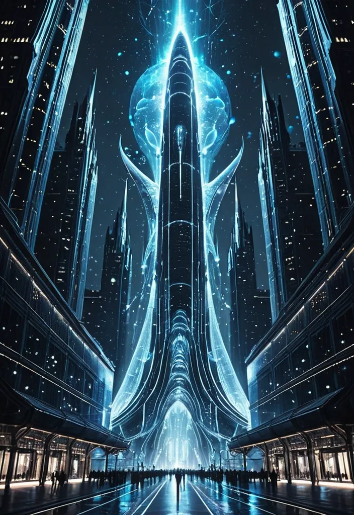 Towering spires of crystalline advanced technology pierce the atmosphere of a gas giant within a colossal , transparent whale's body , swimming through the cosmic sky. The city's architecture is sleek , bioluminescent , and organic , mirroring the whale's internal structure. Tiny , agile spacecraft navigate the energetic pathways , leaving trails of light. The perspective is from a high vantage point , capturing the immense scale and complexity of the futuristic city. The exterior of the whale is visible , adorned with constellations. Style: Celestial , ethereal , abstract , digital art black Lighting: Dramatic backlighting , bright glowing particles , contrasting dark background Composition: dynamic diagonal , composition , upward gaze Details: Sparkling gray waves and smoke , streaking white light trails , sense of movement and wonder , magical atmosphere Quality: High detail , 4K , Masterpiece , Rendered in Octane. ,