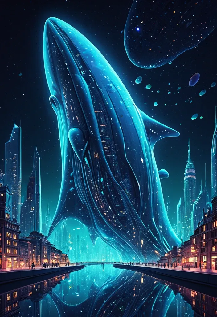 A breathtaking vista of a futuristic city that exists entirely within a colossal , transparent whale's body , swimming through the cosmic ocean. The city's architecture is sleek , bioluminescent , and organic , mirroring the whale's internal structure. Streams of starlight flow like water through the city's canals. The exterior of the whale is visible , adorned with constellations. Rendered in a vibrant , surrealist style with sharp , clean lines and a luminous color palette , reminiscent of Moebius , high resolution realistic textures. 16:9 aspect ratio ,