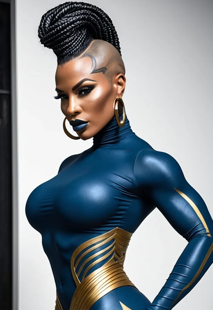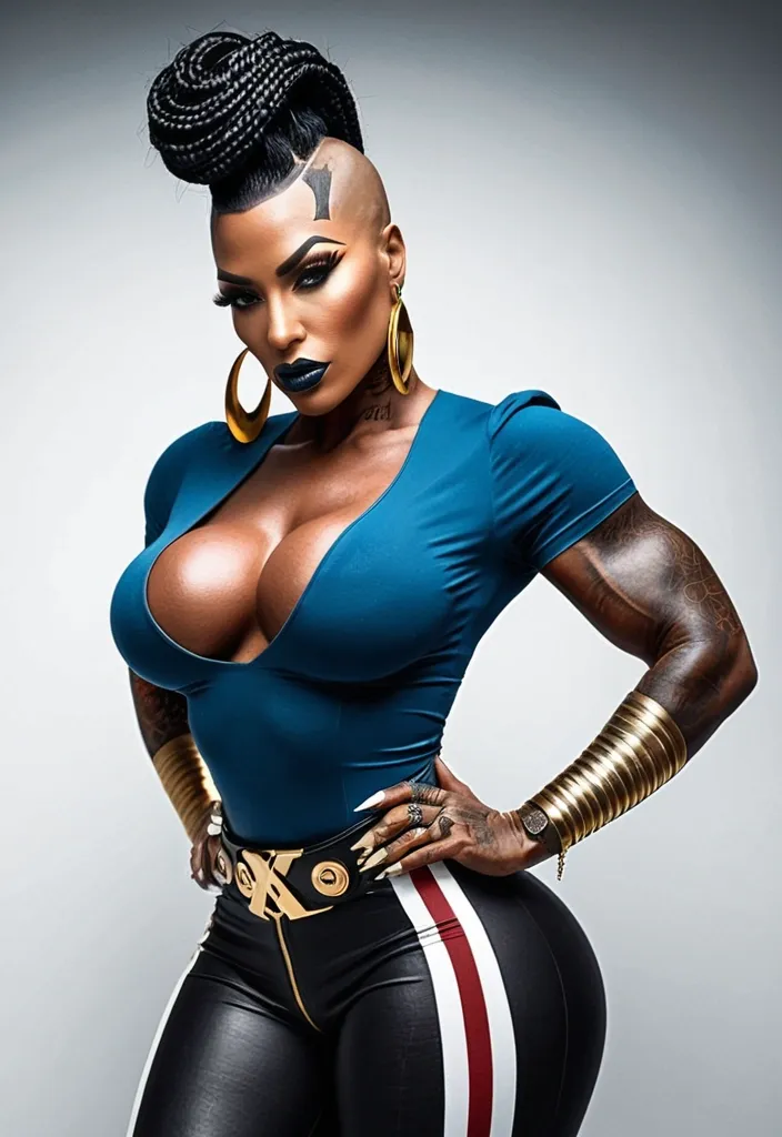 Generate Gorgeous female boss , bimbo , hourglass body , dark-skinned African-American , pointy face , abnormally massive female bodybuilder , gorgeous , close up , full lips , big booty , black hair , braided design mohawk , bald on the side , feminine silhouette , too big breast , big booty , sexy thighs abs , silhouette , up close , flexing biceps , gorgeous hazel eyes , legs are iconic and defining physical feature , both visually and in terms of combat ability.wearing an outfit that is a striking blend of elegance , power , and femininity , designed to command attention in any room. The suit is tailored to perfection , hugging the wearer’s curves with precision while emphasizing a structured silhouette. The fabric itself is a refined grey tweed patterned with subtle white grid lines , giving the suit a texture that feels both sophisticated and modern. The blazer features broad blue lapels and gold button accents , adding a luxurious touch that elevates the look beyond typical business attire. The matching high-waisted trousers elongate the frame , further enhancing the poised and commanding effect of the ensemble.The styling choices amplify the boldness of the suit. The inner blouse is a silky , greybutton-down shirt that complements the tweed’s tone while introducing a softer , feminine balance to the sharp tailoring of the jacket. The blouse peeks out neatly from under the blazer , maintaining elegance without drawing focus away from the suit’s commanding cut. Accessories are kept minimal yet intentional: a delicate layered gold necklace and hoop earrings that add glimmers of light and luxury without overpowering the outfit. The choice of voluminous , honey-brown braids cascading down her shoulders frames the face with both confidence and glamour , completing the commanding visual.Altogether , this look communicates a blend of authority and allure. It is business-ready yet fashion-forward , balancing corporate structure with vibrant femininity. The color palette blue , grey and gold avoids being overly delicate , instead embracing the richness of texture , structure , and presence. This is the kind of ensemble that speaks to ambition , sophistication , and personal style—ideal for someone who thrives in positions of influence but insists on expressing her individuality with bold elegance. It’s not just clothing—it’s a statement of power wrapped in grace. Stacked hourglass silhouette , t-shirt , modest t-shirt , enormous butt , enormous breast , red and white striped t -shirt , gold metal belt , black leather pants , ,