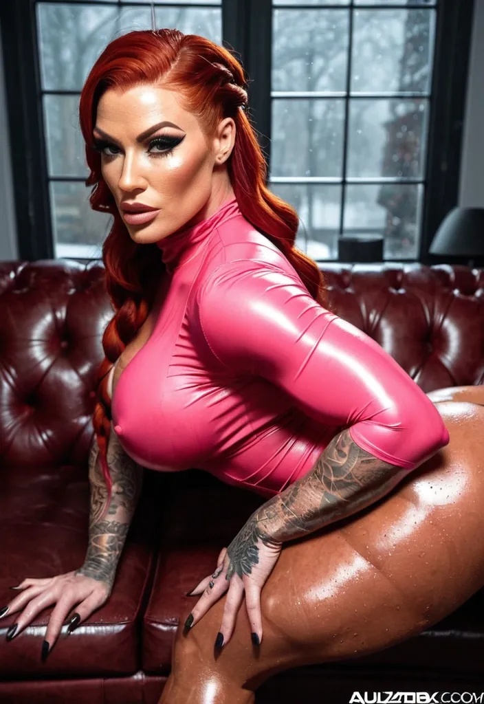 Generate Gorgeous female boss , bimbo , hourglass body , abnormally massive female bodybuilder , gorgeous , close up , full lips , big booty , redheaded , freckles on face and breast , braided design hair , feminine silhouette , too big breast , big booty , sexy thighs abs , silhouette , up close , flexing biceps , beautiful green eyes , legs are iconic and defining physical feature , both visually and in terms of combat ability.wearing an outfit that is a striking blend of elegance , power , and femininity , designed to command attention in any room. The suit is tailored to perfection , hugging the wearer’s curves with precision while emphasizing a structured silhouette. The fabric itself is a refined grey tweed patterned with subtle white grid lines , giving the suit a texture that feels both sophisticated and modern. The blazer features broad blue lapels and gold button accents , adding a luxurious touch that elevates the look beyond typical business attire. The matching high-waisted trousers elongate the frame , further enhancing the poised and commanding effect of the ensemble.The styling choices amplify the boldness of the suit. The inner blouse is a silky , greybutton-down shirt that complements the tweed’s tone while introducing a softer , feminine balance to the sharp tailoring of the jacket. The blouse peeks out neatly from under the blazer , maintaining elegance without drawing focus away from the suit’s commanding cut. Accessories are kept minimal yet intentional: a delicate layered gold necklace and hoop earrings that add glimmers of light and luxury without overpowering the outfit. The choice of voluminous , honey-brown braids cascading down her shoulders frames the face with both confidence and glamour , completing the commanding visual.Altogether , this look communicates a blend of authority and allure. It is business-ready yet fashion-forward , balancing corporate structure with vibrant femininity. The color palette blue , grey and gold avoids being overly delicate , instead embracing the richness of texture , structure , and presence. This is the kind of ensemble that speaks to ambition , sophistication , and personal style—ideal for someone who thrives in positions of influence but insists on expressing her individuality with bold elegance. It’s not just clothing—it’s a statement of power wrapped in grace. In luxury living legs that could crush a watermelon , skirt high boots are a bold and striking statement piece , crafted in glossy black patent leather that gives them a sleek , polished finish. Rising to just below the knee , the boots feature three adjustable buckle straps along the shaft , adding both edge and detail to their design. The towering stiletto heel , paired with a thick platform sole , creates an ultra-dramatic silhouette that elongates the leg and exudes power and confidence. With their combination of shine , height , and structure , these boots perfectly balance fierce femininity with high-fashion allure. She is leaning forward flirtatiously on a leather couch , her tight pink blouse straining against her exaggerated curves as she gazes directly at the viewer with a sultry expression. The rain-streaked window behind her adds a moody , intimate atmosphere to the scene. ,