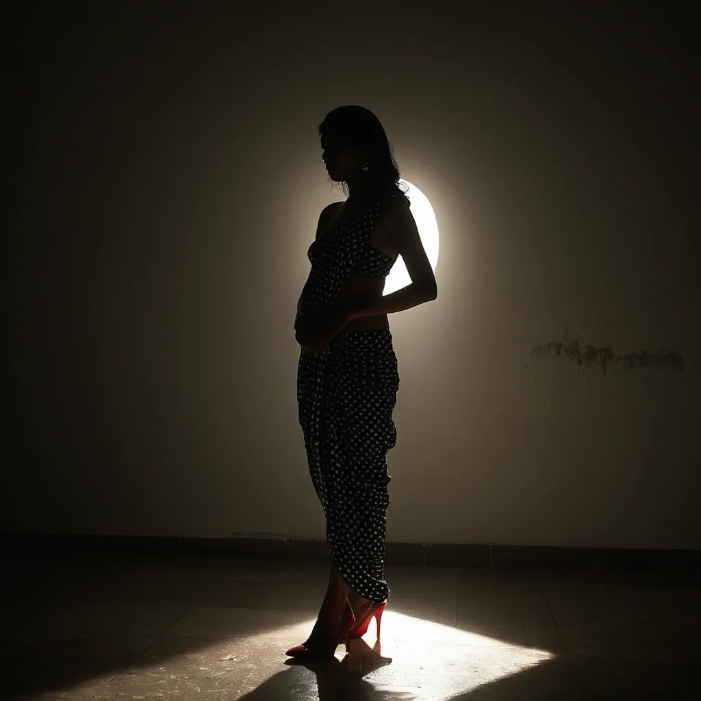 photography , Indian woman , she is wearing a black polka-dot Saree and red high heels , minimalist scene , standing side with 45 degree head and gaze to front , bathing in a shaft of light that breaks through an otherwise shadow filled sparse space , convey a sense of peace and introspection , contrasts of light and dark to emphasize the textures of the figure’s clothing and the simplicity of the surroundings , light highlight the contours of her face and body , soft dramatic visual , rich detailing --ar 9:16 --raw --stylize 200 ,
