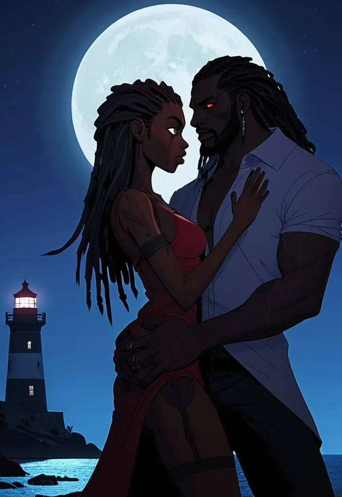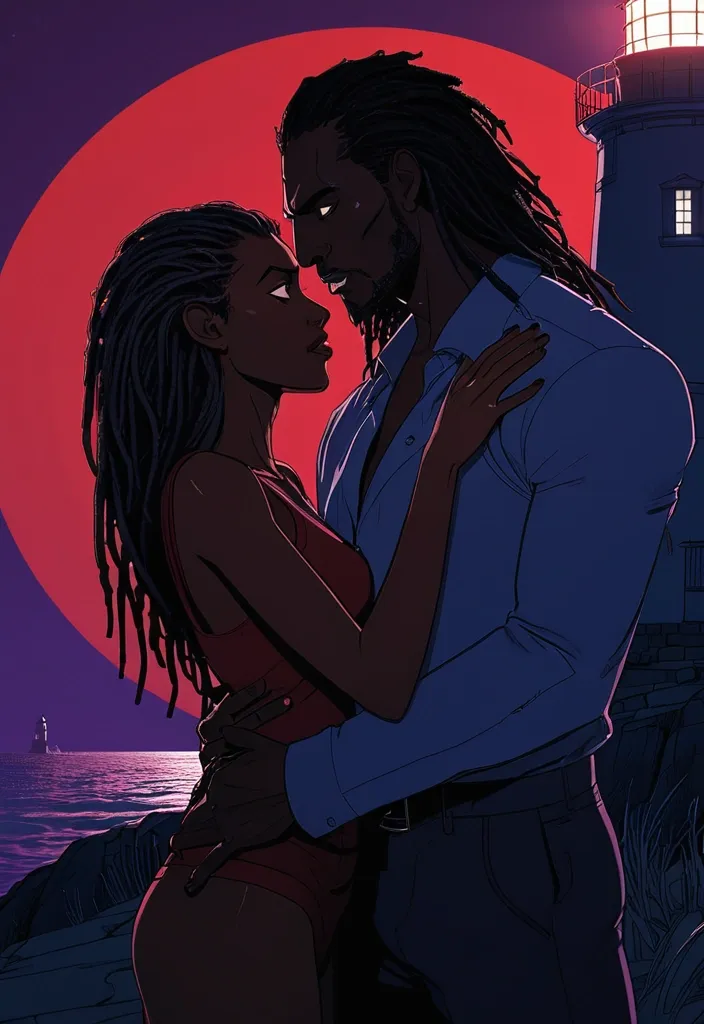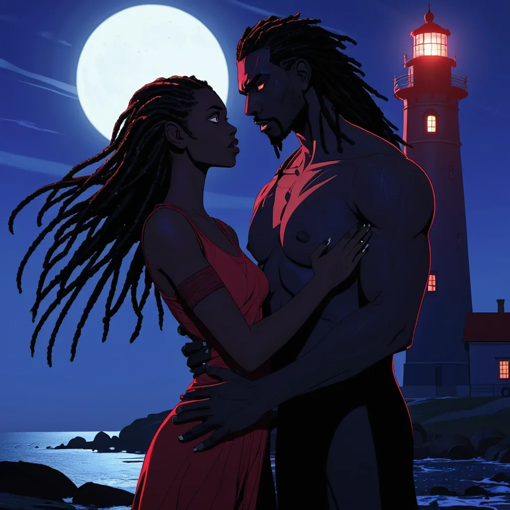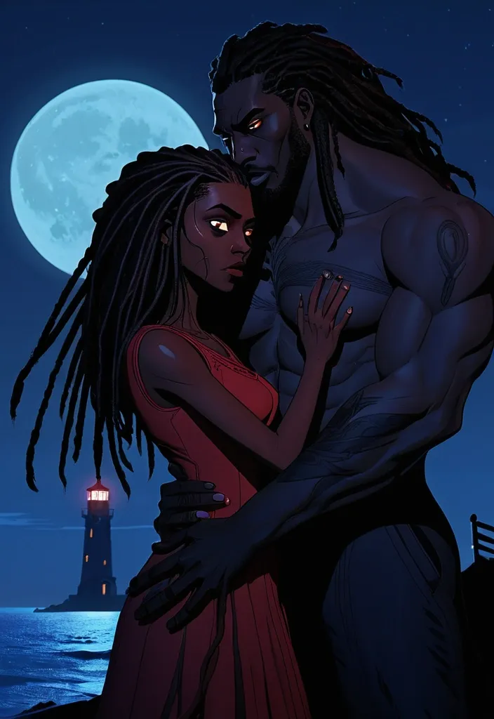 A slender , graceful vampire and a strong , imposing werewolf stand embraced near a moonlit lighthouse. The scene is rendered in a graphic novel style , with bold lines and dramatic shadows. She , with her dark skin , long dark dreadlocks , and subtle reddish hue in her eyes , is demonstrating affection , her arms wrapped around him , her head resting against his chest. He , with his dark skin , dreadlocks , and wolf-like eyes , is demonstrating care , his arms protectively encircling her , his gaze watchful. The lighthouse beam sweeps across them , casting long shadows and highlighting their contrasting silhouettes. The overall color palette is rich and saturated , with deep blues , purples , and reds dominating , creating a sense of intimacy and timeless love. ,
