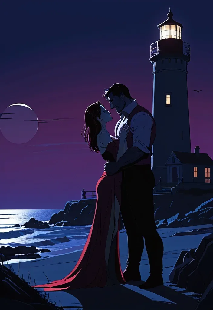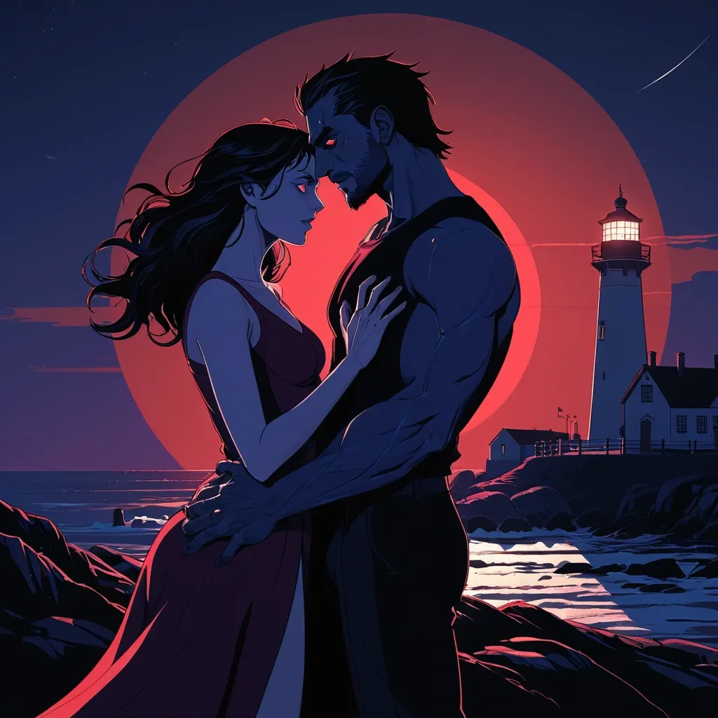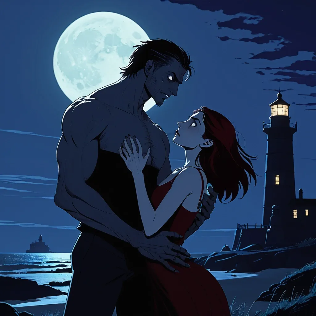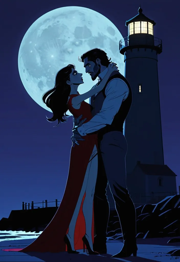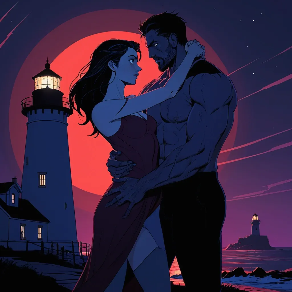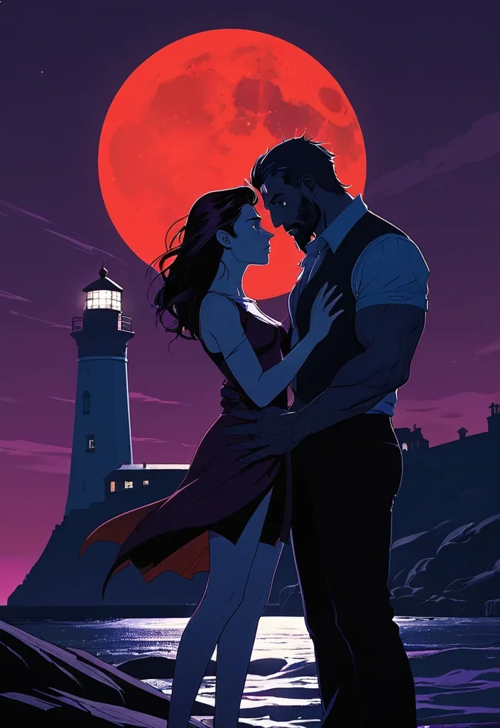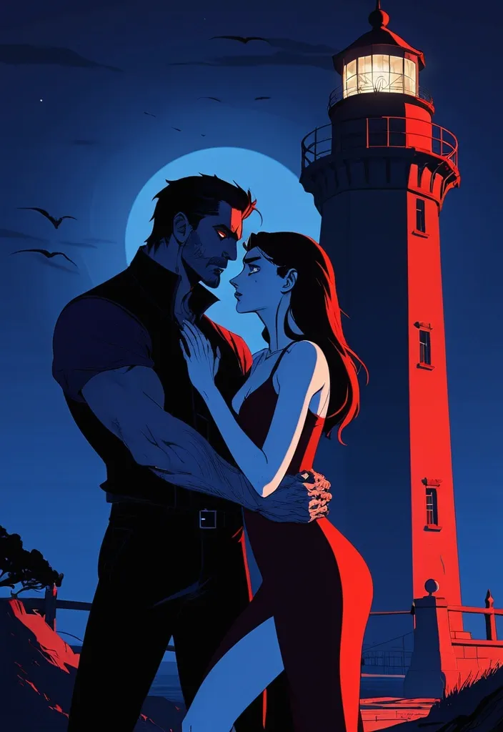 A slender , graceful vampire and a strong , imposing werewolf stand embraced near a moonlit lighthouse. The scene is rendered in a graphic novel style , with bold lines and dramatic shadows. She is demonstrating affection , her arms wrapped around him , her head resting against his chest. He is demonstrating care , his arms protectively encircling her , his gaze watchful. The lighthouse beam sweeps across them , casting long shadows and highlighting their contrasting silhouettes. The overall color palette is rich and saturated , with deep blues , purples , and reds dominating , creating a sense of intimacy and timeless love. ,