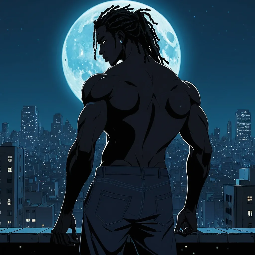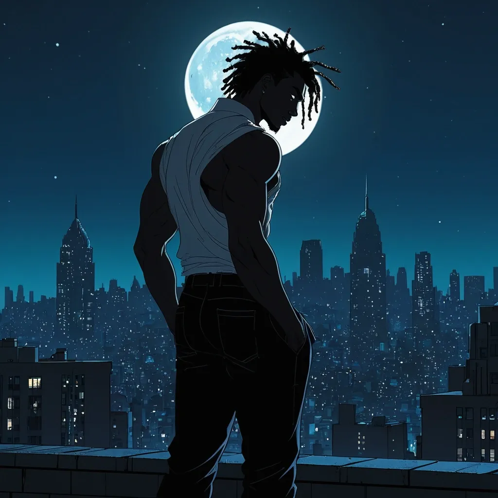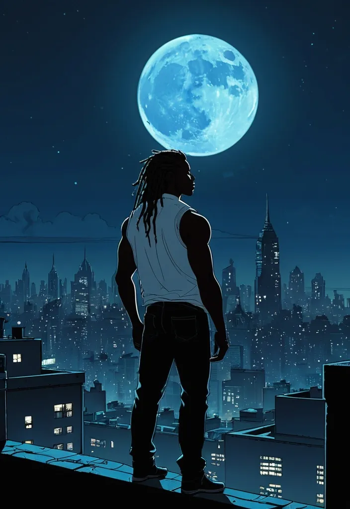 "A strong , imposing figure stands on a rooftop , back to the viewer , gazing intently at the moon. The scene is rendered in a graphic novel style , with bold lines and dramatic shadows. He has his hands in his pockets , dressed in casual evening wear. His dark skin is subtly illuminated by the city lights below , hinting at his muscular build. His dreadlocks are visible even in silhouette , cascading down his back. His entire posture conveys a sense of longing and contemplation directed solely at the moon above. The city lights twinkle below , but his undivided attention is fixed on the lunar orb , which casts a soft glow on his back. The overall color palette is rich and saturated , with deep blues , purples , and reds dominating , creating a sense of solitude and longing. His piercing eyes , though unseen , possess a wolf-like coloration , adding to his imposing presence." ,