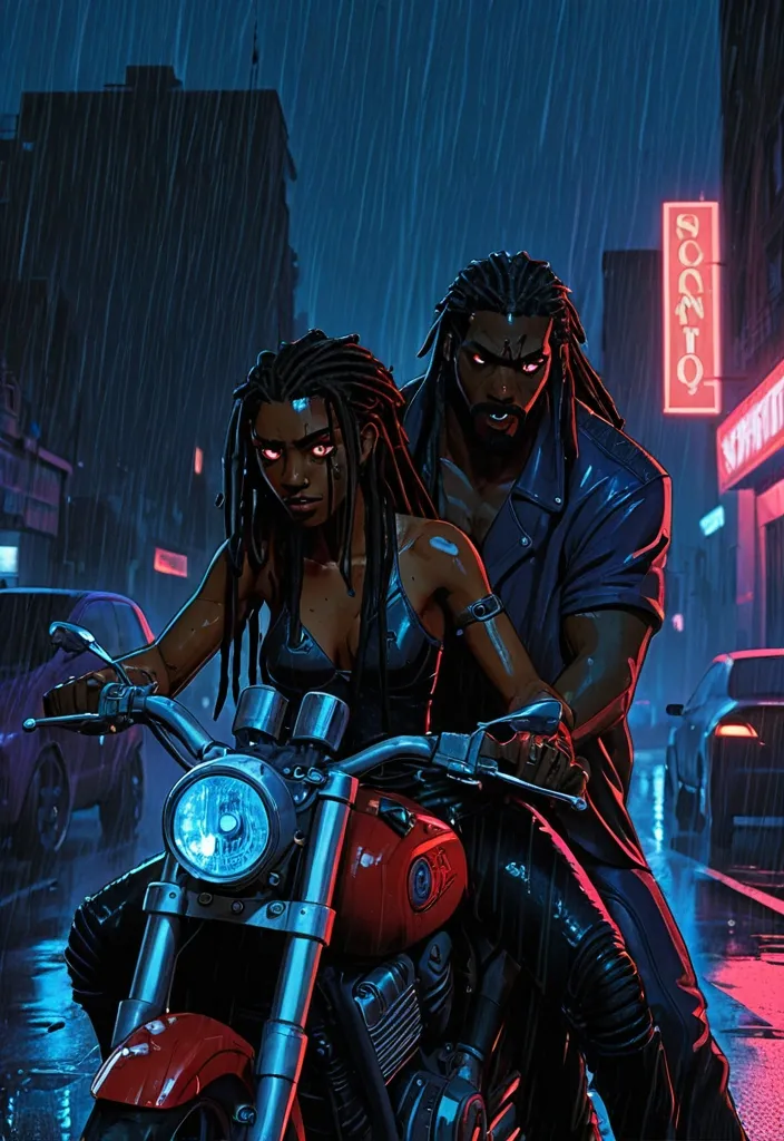 A slender , graceful vampire and a strong , imposing werewolf stand embraced beside a motorcycle on a rainy night. The scene is rendered in a graphic novel style , with bold lines and dramatic shadows. Rain streaks across the frame , illuminated by the headlights of the motorcycle and the neon signs of a passing city. She , with her dark skin , long dark dreadlocks , and subtle reddish hue in her eyes , is clinging to him , her face buried in his shoulder. He , with his dark skin , dreadlocks , and wolf-like eyes , is holding her tightly , his gaze protective and worried. The motorcycle is their only escape , their symbol of freedom and defiance. The overall color palette is rich and saturated , with deep blues , purples , and reds dominating , creating a sense of urgency , love , and determination. ,