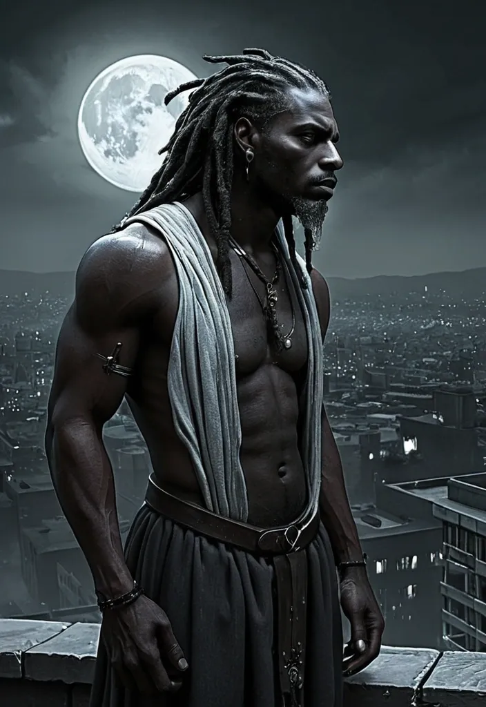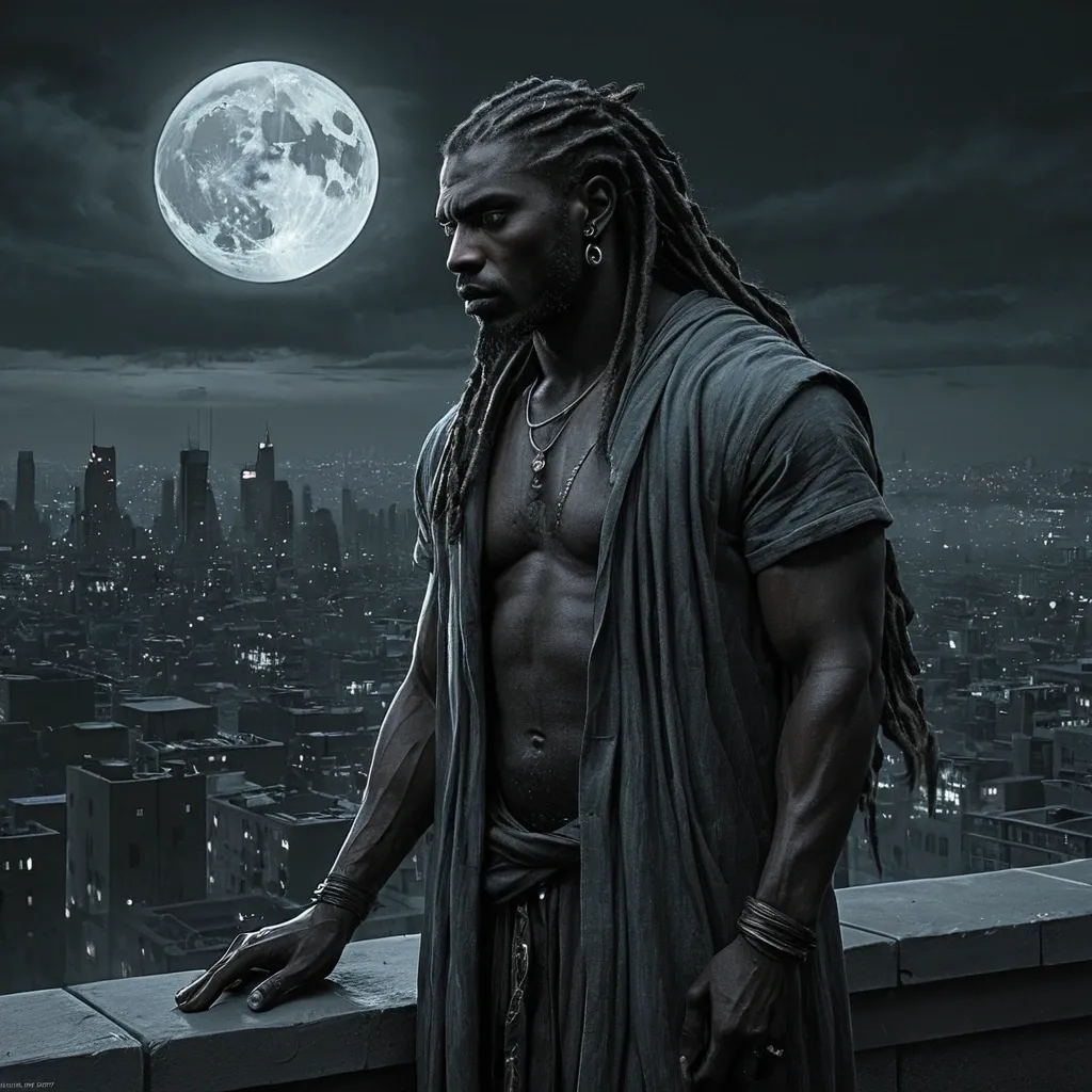 Artstation , Drawing , Graphite , Charcoal Art , "He is a man of imposing presence , his immortality etched subtly into his ageless features. His dark skin is weathered but strong , hinting at a life lived long and hard. His dreadlocks , like hers , are styled in a way that blends tradition with a modern edge. His eyes , with their striking wolf-like coloration , possess a piercing intensity that can be both captivating and unnerving. His gaze is direct and unwavering , conveying a sense of control and hidden danger. He carries himself with the posture of an alpha – shoulders squared , chest out , movements deliberate and purposeful. He is a figure of strength and quiet power , radiating an aura of both confidence and mystery. He might be dressed in a way that reflects his timeless nature – perhaps a well-tailored suit with a vintage flair , or rugged clothing that speaks to his connection with the natural world. Whatever he wears , it is clear that he is a force to be reckoned with – a protector , a provider , and a figure who commands respect without uttering a word." , "Illustration: A solitary scene depicting a man of imposing presence , with dark skin , dreadlocks , and striking eyes with a wolf-like coloration , standing on a rooftop overlooking a sprawling cityscape. He is gazing up at the moon , lost in thought , his expression conveying a deep sense of longing and remembrance. He holds a bottle of liquor in one hand. His eyes , though dry , reflect a profound sadness and the weight of his immortal existence. He is dressed in a way that reflects his timeless nature and his connection to the past. The overall mood is one of quiet contemplation and profound sadness. The style is evocative and atmospheric , capturing the enduring power of his love for her. The moonlight should be a key element , connecting him to her and to their shared past." ,