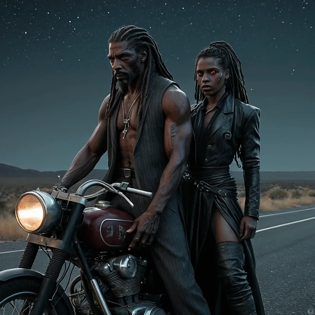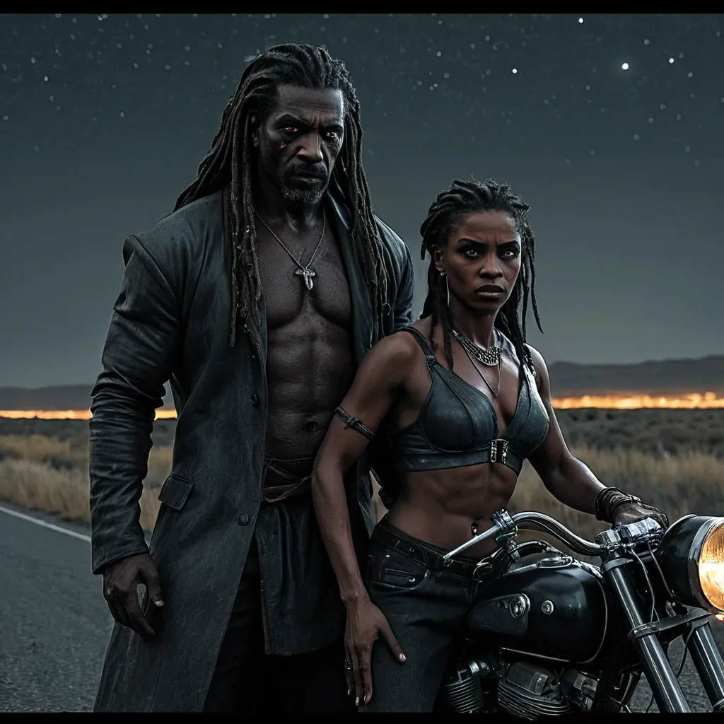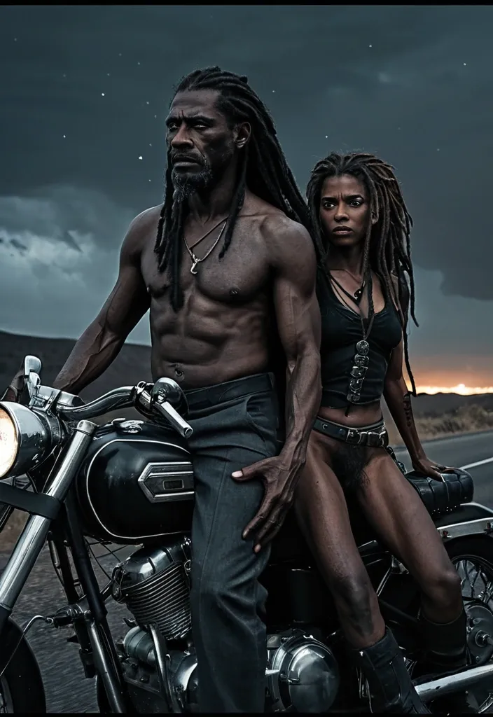Artstation , Drawing , Graphite , Charcoal Art , "He is a man of imposing presence , his immortality etched subtly into his ageless features. His dark skin is weathered but strong , hinting at a life lived long and hard. His dreadlocks , like hers , are styled in a way that blends tradition with a modern edge. His eyes , with their striking wolf-like coloration , possess a piercing intensity that can be both captivating and unnerving. His gaze is direct and unwavering , conveying a sense of control and hidden danger. He carries himself with the posture of an alpha – shoulders squared , chest out , movements deliberate and purposeful. He is a figure of strength and quiet power , radiating an aura of both confidence and mystery. He might be dressed in a way that reflects his timeless nature – perhaps a well-tailored suit with a vintage flair , or rugged clothing that speaks to his connection with the natural world. Whatever he wears , it is clear that he is a force to be reckoned with – a protector , a provider , and a figure who commands respect without uttering a word." , "Illustration: A dramatic , cinematic scene on a desolate highway under a starlit sky. A mature and captivating woman with dark skin , long dark dreadlocks , and striking eyes with reddish irises (similar to that of a vampire) is clinging tightly to a man of imposing presence. This man has dark skin , dreadlocks , and striking eyes with a wolf-like coloration. They are embracing on a vintage motorcycle , leaning against it as if exhausted but defiant. The motorcycle is parked on the side of the road , its headlights cutting through the darkness. Their clothing is modern but weathered , suggesting they have been traveling for a long time. Their expressions are a mixture of determination , love , and desperation , conveying their commitment to staying together against all odds. The overall mood is one of rebellion , freedom , and a desperate fight for love. The style is gritty and realistic , reminiscent of a classic road movie or a dramatic film still. The color palette is dark and moody , with blues , blacks , and hints of red from the motorcycle's taillights and their eyes. The scene should evoke the feeling of 'cometas a voar' (comets flying) and 'um manto estrelado a nos guiar' (a starlit cloak guiding them) , emphasizing their rebellious spirit and their journey together. The image should convey that they are fugitives , running from something , but their love for each other is their primary motivation." , "He is a man of imposing presence , his immortality etched subtly into his ageless features. His dark skin is weathered but strong , hinting at a life lived long and hard. His dreadlocks , like hers , are styled in a way that blends tradition with a modern edge. His eyes , with their striking wolf-like coloration , possess a piercing intensity that can be both captivating and unnerving. His gaze is direct and unwavering , conveying a sense of control and hidden danger. He carries himself with the posture of an alpha – shoulders squared , chest out , movements deliberate and purposeful. He is a figure of strength and quiet power , radiating an aura of both confidence and mystery. He might be dressed in a way that reflects his timeless nature – perhaps a well-tailored suit with a vintage flair , or rugged clothing that speaks to his connection with the natural world. Whatever he wears , it is clear that he is a force to be reckoned with – a protector , a provider , and a figure who commands respect without uttering a word." ,