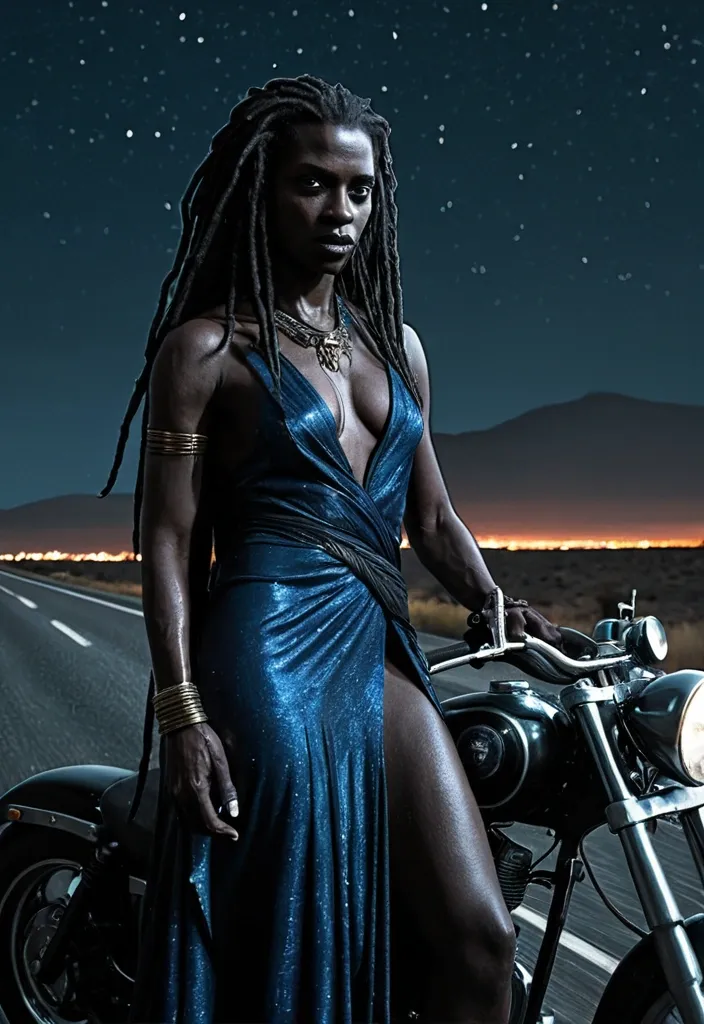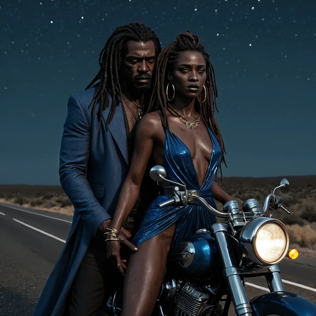 Artstation , Drawing , Graphite , Charcoal Art , "She is a mature and captivating blues singer , her presence commanding attention. Her dark skin carries the subtle marks of time , adding depth to her already expressive features. Her long , dark dreadlocks are styled in a way that speaks to both tradition and modern flair , framing her face with an effortless elegance. Her eyes , striking with their reddish irises (similar to that of a vampire) , hold a depth of experience and a hint of melancholy , reflecting the soul of the blues. She wears a form-fitting dress that hints at sensuality without sacrificing the authenticity of her blues persona. The dress might be a modern take on a classic blues silhouette – perhaps a shimmering , sequined gown with a daring neckline , or a sleek , velvet number with strategic cutouts. She accessorizes with bold , statement jewelry – chunky gold necklaces , stacks of bracelets , and large hoop earrings – that add a touch of glamour to her look. Her overall style is a blend of classic blues aesthetics and contemporary fashion , reflecting her status as a timeless artist who remains relevant in the modern world. Her voice is her most powerful asset – a raw , soulful instrument that conveys the pain , passion , and resilience of the blues." , "Illustration: A dramatic , cinematic scene on a desolate highway under a starlit sky. A mature and captivating woman with dark skin , long dark dreadlocks , and striking eyes with reddish irises (similar to that of a vampire) is clinging tightly to a man of imposing presence. This man has dark skin , dreadlocks , and striking eyes with a wolf-like coloration. They are embracing on a vintage motorcycle , leaning against it as if exhausted but defiant. The motorcycle is parked on the side of the road , its headlights cutting through the darkness. Their clothing is modern but weathered , suggesting they have been traveling for a long time. Their expressions are a mixture of determination , love , and desperation , conveying their commitment to staying together against all odds. The overall mood is one of rebellion , freedom , and a desperate fight for love. The style is gritty and realistic , reminiscent of a classic road movie or a dramatic film still. The color palette is dark and moody , with blues , blacks , and hints of red from the motorcycle's taillights and their eyes. The scene should evoke the feeling of 'cometas a voar' (comets flying) and 'um manto estrelado a nos guiar' (a starlit cloak guiding them) , emphasizing their rebellious spirit and their journey together. The image should convey that they are fugitives , running from something , but their love for each other is their primary motivation." , "He is a man of imposing presence , his immortality etched subtly into his ageless features. His dark skin is weathered but strong , hinting at a life lived long and hard. His dreadlocks , like hers , are styled in a way that blends tradition with a modern edge. His eyes , with their striking wolf-like coloration , possess a piercing intensity that can be both captivating and unnerving. His gaze is direct and unwavering , conveying a sense of control and hidden danger. He carries himself with the posture of an alpha – shoulders squared , chest out , movements deliberate and purposeful. He is a figure of strength and quiet power , radiating an aura of both confidence and mystery. He might be dressed in a way that reflects his timeless nature – perhaps a well-tailored suit with a vintage flair , or rugged clothing that speaks to his connection with the natural world. Whatever he wears , it is clear that he is a force to be reckoned with – a protector , a provider , and a figure who commands respect without uttering a word." ,