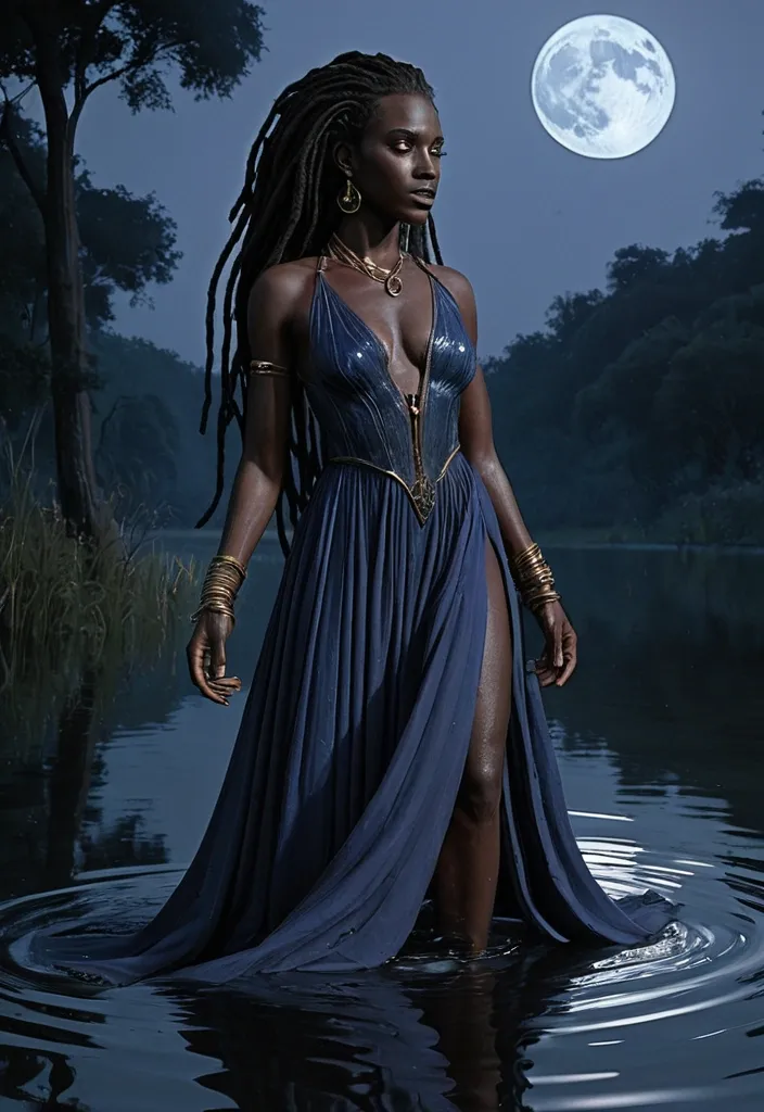 Artstation , Drawing , Graphite , Charcoal Art , "She is a mature and captivating blues singer , her presence commanding attention. Her dark skin carries the subtle marks of time , adding depth to her already expressive features. Her long , dark dreadlocks are styled in a way that speaks to both tradition and modern flair , framing her face with an effortless elegance. Her eyes , striking with their reddish irises (similar to that of a vampire) , hold a depth of experience and a hint of melancholy , reflecting the soul of the blues. She wears a form-fitting dress that hints at sensuality without sacrificing the authenticity of her blues persona. The dress might be a modern take on a classic blues silhouette – perhaps a shimmering , sequined gown with a daring neckline , or a sleek , velvet number with strategic cutouts. She accessorizes with bold , statement jewelry – chunky gold necklaces , stacks of bracelets , and large hoop earrings – that add a touch of glamour to her look. Her overall style is a blend of classic blues aesthetics and contemporary fashion , reflecting her status as a timeless artist who remains relevant in the modern world. Her voice is her most powerful asset – a raw , soulful instrument that conveys the pain , passion , and resilience of the blues." , "He is a man of imposing presence , his immortality etched subtly into his ageless features. His dark skin is weathered but strong , hinting at a life lived long and hard. His dreadlocks , like hers , are styled in a way that blends tradition with a modern edge. His eyes , with their striking wolf-like coloration , possess a piercing intensity that can be both captivating and unnerving. His gaze is direct and unwavering , conveying a sense of control and hidden danger. He carries himself with the posture of an alpha – shoulders squared , chest out , movements deliberate and purposeful. He is a figure of strength and quiet power , radiating an aura of both confidence and mystery. He might be dressed in a way that reflects his timeless nature – perhaps a well-tailored suit with a vintage flair , or rugged clothing that speaks to his connection with the natural world. Whatever he wears , it is clear that he is a force to be reckoned with – a protector , a provider , and a figure who commands respect without uttering a word." , "Illustration: A dreamlike scene bathed in soft , ethereal moonlight , representing a cherished memory at their secret , secluded lake. A woman , a mature and captivating presence with dark skin , long , flowing dark dreadlocks ('um rio de ébano a deslizar' - a river of ebony sliding down) , and striking eyes with reddish irises (similar to that of a vampire) , is dancing gracefully at the edge of the lake. She is wearing a delicate , flowing dress that resembles a blooming flower ('Seu vestido , a pétala de uma flor a desabrochar' - Her dress , the petal of a flower blooming). Her movements are fluid and expressive , conveying a sense of joy and freedom. Seated on the bank of the lake , a man of imposing presence with dark skin , dreadlocks , and striking eyes with a wolf-like coloration watches her with a loving and protective gaze. The lake is surrounded by lush vegetation and ancient trees , creating a sense of timeless beauty and seclusion. The overall mood is one of longing , nostalgia , and idealized beauty , representing their private sanctuary. The style is romantic and ethereal , reminiscent of a Pre-Raphaelite painting or a dream sequence in a classic film. The color palette is soft and pastel , with gentle hues of pink , purple , and gold dominating , reflecting the moonlight and the natural beauty of the scene." ,