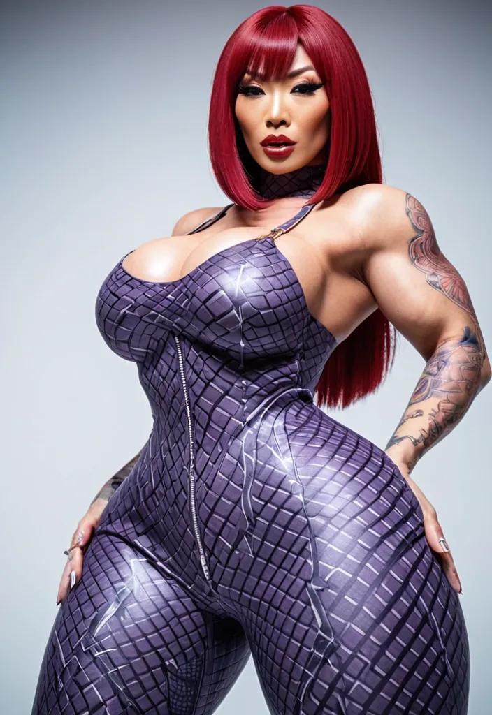Generate Gorgeous female boss , bimbo , hourglass body , Japanese woman , abnormally massive female bodybuilder , gorgeous , close up , full lips , big booty , red hair , bob-cut hair style , feminine silhouette , too big breast , big booty , sexy thighs abs , silhouette , up close , flexing biceps , beautiful green eyes , legs are iconic and defining physical feature , both visually and in terms of combat ability.wearing an outfit that is a striking blend of elegance , power , and femininity , designed to command attention in any room. The suit is tailored to perfection , hugging the wearer’s curves with precision while emphasizing a structured silhouette. The fabric itself is a refined grey tweed patterned with subtle white grid lines , giving the suit a texture that feels both sophisticated and modern. The blazer features broad blue lapels and gold button accents , adding a luxurious touch that elevates the look beyond typical business attire. The matching high-waisted trousers elongate the frame , further enhancing the poised and commanding effect of the ensemble.The styling choices amplify the boldness of the suit. The inner blouse is a silky , greybutton-down shirt that complements the tweed’s tone while introducing a softer , feminine balance to the sharp tailoring of the jacket. The blouse peeks out neatly from under the blazer , maintaining elegance without drawing focus away from the suit’s commanding cut. Accessories are kept minimal yet intentional: a delicate layered gold necklace and hoop earrings that add glimmers of light and luxury without overpowering the outfit. The choice of voluminous , honey-brown braids cascading down her shoulders frames the face with both confidence and glamour , completing the commanding visual.Altogether , this look communicates a blend of authority and allure. It is business-ready yet fashion-forward , balancing corporate structure with vibrant femininity. The color palette blue , grey and gold avoids being overly delicate , instead embracing the richness of texture , structure , and presence. This is the kind of ensemble that speaks to ambition , sophistication , and personal style—ideal for someone who thrives in positions of influence but insists on expressing her individuality with bold elegance. It’s not just clothing—it’s a statement of power wrapped in grace. In luxury living legs that could crush a watermelon , skirt high boots are a bold and striking statement piece , crafted in glossy black patent leather that gives them a sleek , polished finish. Rising to just below the knee , the boots feature three adjustable buckle straps along the shaft , adding both edge and detail to their design. The towering stiletto heel , paired with a thick platform sole , creates an ultra-dramatic silhouette that elongates the leg and exudes power and confidence. With their combination of shine , height , and structure , these boots perfectly balance fierce femininity with high-fashion allure. Enormous breast , , Up close shot , cyber space purple patterned dress , full body shot , gray denim pants ,