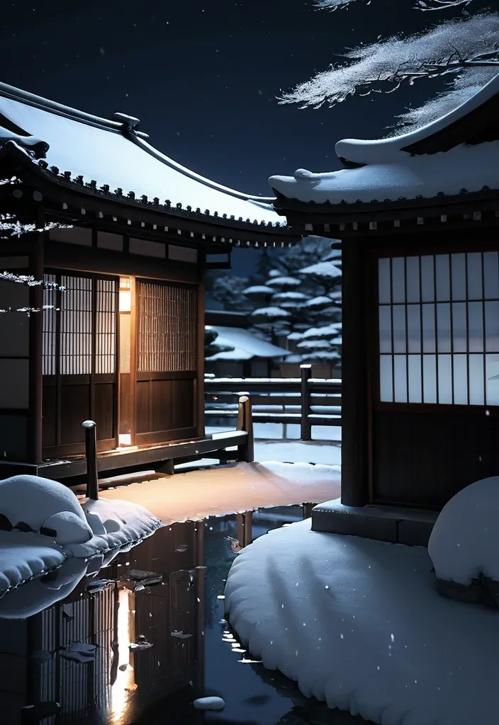 In photorealistic style , generate a landscape format image in soft moonlight lighting. In the background , there is a Japanese teahouse with a shoji style door open. Through the open door , you can see the interior of a teahouse room with traditional Japanese furniture and the blurred image of a man and a woman wearing kimonos. The lighting of the background is soft and warm. In the foreground , there is a winter setting , with a traditional Japanese wooden gate and wooden fence. There is snow on the ground and there are huge icicles hanging from the gate , dripping slightly. The moonlight is reflected on the sparkling snow on the ground , the fence , and the gate , and it is brightly reflected in the icicles. ,