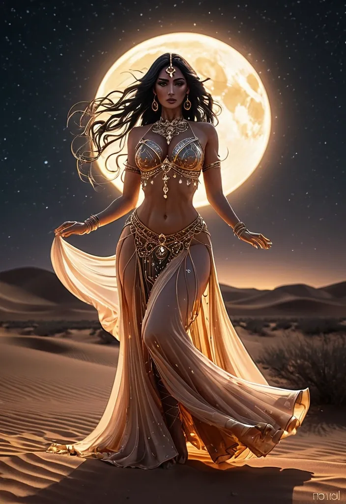 masterpiece , best quality , ultra detailed , high resolution , anime style , beautiful young woman , belly dancer , elegant and graceful pose , wearing luxurious belly dance costume , intricate details , gold jewelry , chains , gemstones , ornaments , decorated bra top , sheer silk fabric , long flowing skirt , midriff exposed , slim waist , soft curves , dynamic dancing motion , hair flowing in motion , long shiny hair , expressive eyes , soft blush , desert night , moonlight , stars in the sky , warm cinematic lighting , soft glow , depth of field , dramatic shadows , highly detailed background Negative prompt: low quality , worst quality , blurry , bad anatomy , extra fingers , extra limbs , missing fingers , deformed hands , poorly drawn face , bad proportions , mutated body , watermark , text , logo ,