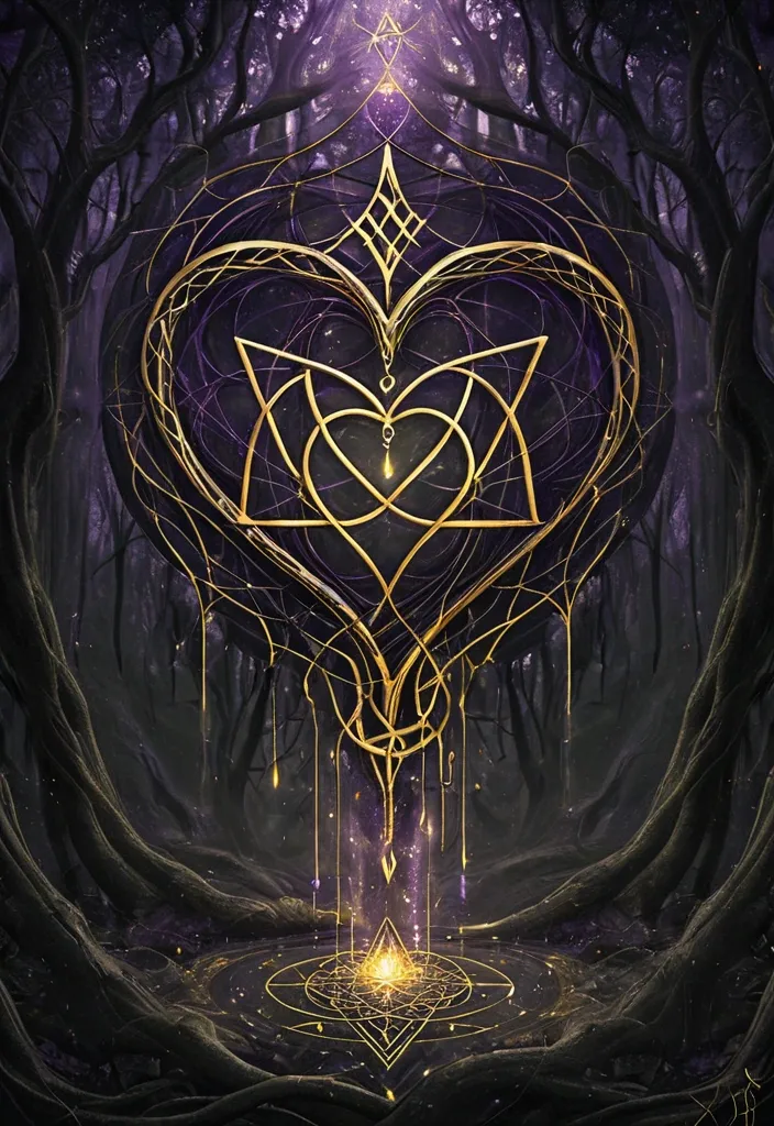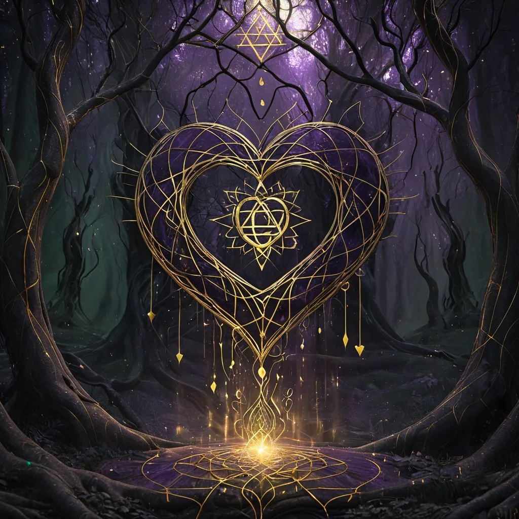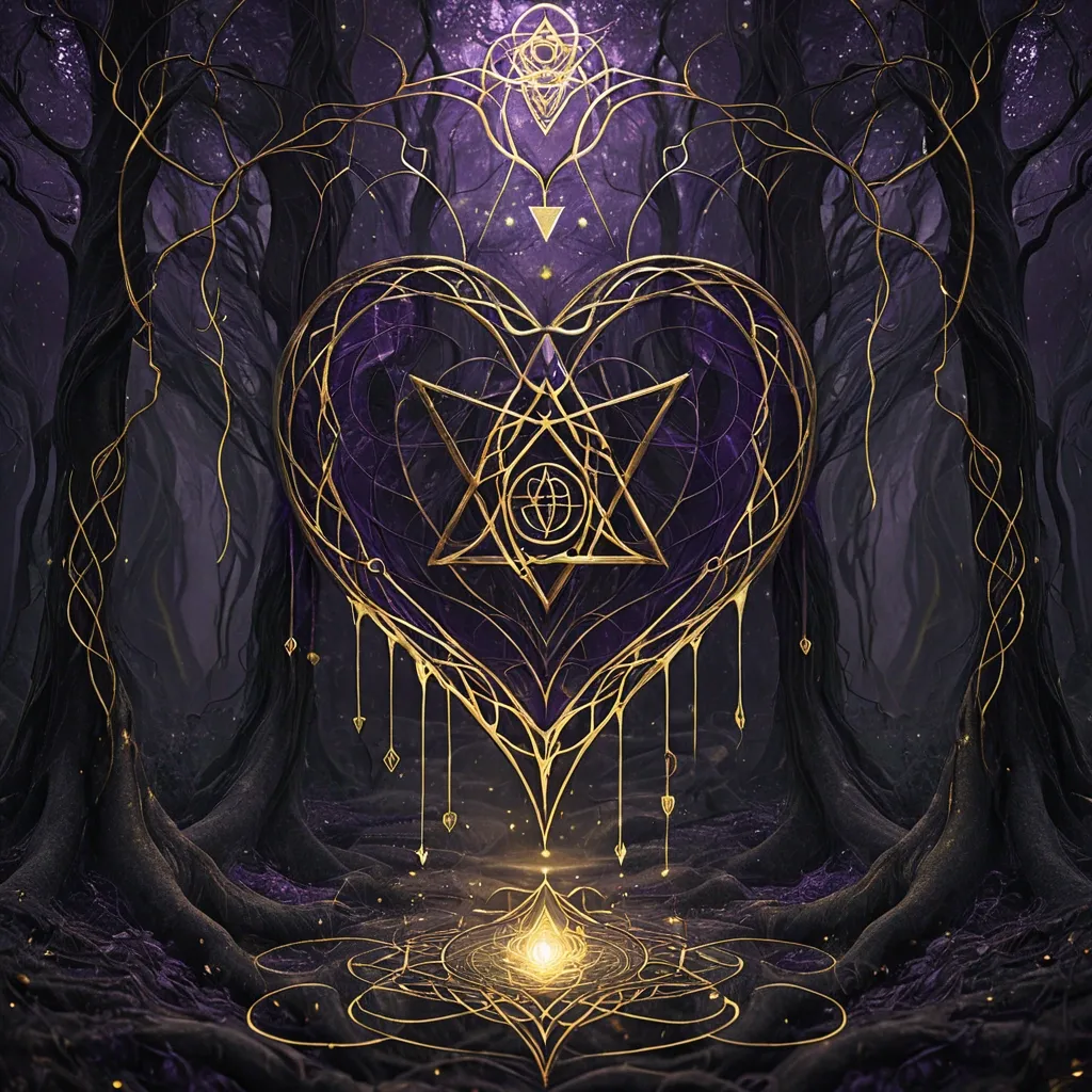 Masterpiece: **Mystical digital painting , sacred geometry , tender light** **A dark heart cracked open with gold light pouring out , rooted like a tree** **Forest background with floating Hebrew letters and Celtic knots** **Color palette:** Charcoal , deep violet , antique gold , forest green **Style:** Ethereal , symbolic , semi-transparent Octane render , 8k ,