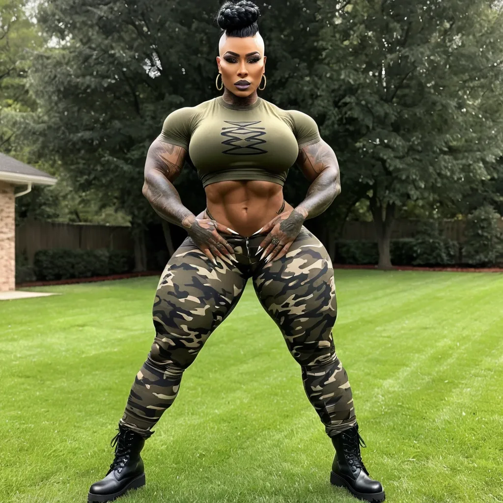 Generate Gorgeous 24 years old , female boss , dark-skinned African-American woman , pointy face , bimbo , hourglass body , abnormally massive female bodybuilder , gorgeous , close up , full lips , big booty , braided-styled-mohawk-bald-on the side , feminine silhouette , too big breast , big booty , sexy thighs abs , silhouette , up close , flexing biceps , big gorgeous honey-hazel eyes , legs are iconic and defining physical feature , both visually and in terms of combat ability.wearing an outfit that is a striking blend of elegance , power , and femininity , designed to command attention in any room. The suit is tailored to perfection , hugging the wearer’s curves with precision while emphasizing a structured silhouette. The fabric itself is a refined grey tweed patterned with subtle white grid lines , giving the suit a texture that feels both sophisticated and modern. The blazer features broad blue lapels and gold button accents , adding a luxurious touch that elevates the look beyond typical business attire. The matching high-waisted trousers elongate the frame , further enhancing the poised and commanding effect of the ensemble.The styling choices amplify the boldness of the suit. The inner blouse is a silky , greybutton-down shirt that complements the tweed’s tone while introducing a softer , feminine balance to the sharp tailoring of the jacket. The blouse peeks out neatly from under the blazer , maintaining elegance without drawing focus away from the suit’s commanding cut. Accessories are kept minimal yet intentional: a delicate layered gold necklace and hoop earrings that add glimmers of light and luxury without overpowering the outfit. The choice of voluminous , honey-brown braids cascading down her shoulders frames the face with both confidence and glamour , completing the commanding visual.Altogether , this look communicates a blend of authority and allure. It is business-ready yet fashion-forward , balancing corporate structure with vibrant femininity. The color palette blue , grey and gold avoids being overly delicate , instead embracing the richness of texture , structure , and presence. This is the kind of ensemble that speaks to ambition , sophistication , and personal style—ideal for someone who thrives in positions of influence but insists on expressing her individuality with bold elegance. It’s not just clothing—it’s a statement of power wrapped in grace. In luxury living legs that could crush a watermelon , skirt high boots are a bold and striking statement piece , crafted in glossy black patent leather that gives them a sleek , polished finish. Rising to just below the knee , the boots feature three adjustable buckle straps along the shaft , adding both edge and detail to their design. The towering stiletto heel , paired with a thick platform sole , creates an ultra-dramatic silhouette that elongates the leg and exudes power and confidence. With their combination of shine , height , and structure , these boots perfectly balance fierce femininity with high-fashion allure. High cheekbones , prominent jawline , big gorgeous honey-hazel eyes , enormous breast , camouflage T-shirt. Green , brown and black camouflage pants , black combat boots , enormous breast , enormous butt , small waist , abs , standing on turf grass outside ,
