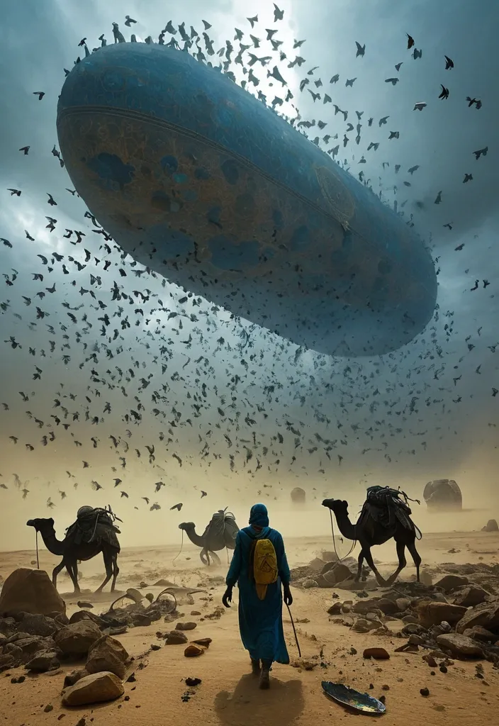 Debris—stones , dust , and fragments—rise from the ground , suspended within the turbulence. Arabian black desert and in front a silhouette of Ancient migrate with their camels and belongings , and in front of them is a caravan leader enter in Wings , appears to dissolve into a shifting , storm-like formation made of blues , greens , yellows , and muted reds. Emerging from this mist is a single giant spacecraft , its vivid blend of blue and yellow and centered. The propeller are rendered with striking detail , tapering outward as though the spacecraft belongs to something alive hidden within the vapor. To the left of the iris , a Wings is partially embedded in the clouded sky , revealing a bright blue sky with white clouds beyond it. The sky sits at eye level , almost aligned with the gaze itself , giving the impression that the spacecraft is looking outward—or inward—through the opening. The surrounding clouds billow up to the ceiling. ,