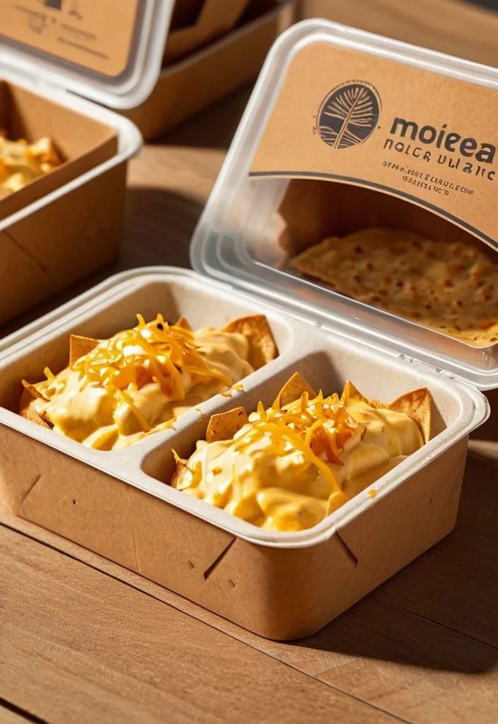 CaracterĂsticas del producto: Nachos On The Go con Queso Cheddar đź§€ Sabor intenso y autĂ©ntico: Elaborados con maĂz natural y un toque de sal , los nachos ofrecen un sabor tradicional y equilibrado que combina perfectamente con la salsa de queso cheddar cremosa. 🌽 Textura crujiente: Gracias a su proceso de horneado controlado , los nachos mantienen una textura ligera , firme y crocante hasta el momento de consumirlos. 🍯 Salsa cheddar lista para disfrutar: La salsa tiene una consistencia suave y sabor intenso a queso , envasada en porciones individuales para conservar su frescura y practicidad. 🌎 Empaque ecolĂłgico y funcional: Presentados en envase de cartĂłn kraft reciclable , con compartimiento interno que evita derrames y mantiene la calidad del producto. 🚶‍♀️ PorciĂłn individual y práctica: Ideal para consumir en movimiento , en la universidad , el trabajo o al viajar; tamaño compacto que facilita su transporte y almacenamiento. đź’› Diseño atractivo y moderno: Su presentaciĂłn en tonos mostaza y tierra resalta su origen natural y su propuesta de marca sostenible y juvenil. ,