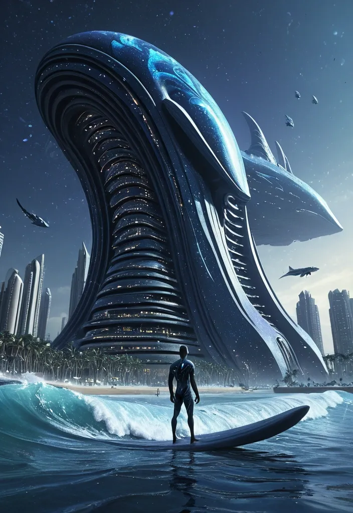 A man on a surf board waiting for a wave , suddenly a colossal , 3D architectural rendering of a futuristic and sustainable real estate project in a modern African city built entirely on the back of a giant , resembling a cosmic whale made of stardust. The style is a blend of dark fantasy concept art and epic space opera , with a focus on awe-inspiring scale and ethereal beauty. ,