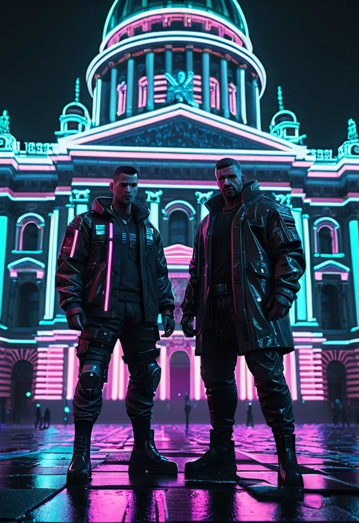 Create a highly detailed cyberpunk-style digital artwork featuring two characters from the gangsters Impact standing together in front of the Kazan Cathedral in Saint Petersburg , Russia. The scene should be set at night with a darker background to make the characters stand out more prominently. Neon lights should subtly illuminate the cathedral and surroundings , but with reduced brightness in the background so the focus is on the characters. Streets should be wet with soft reflections , and there should be minimal ambient light around the edges of the scene. The characters should keep their original outfits but be enhanced with cyberpunk elements such as glowing armor details , augmented weapons , and neon accents. Ultra-realistic , cinematic composition , high detail , 8K resolution. ,