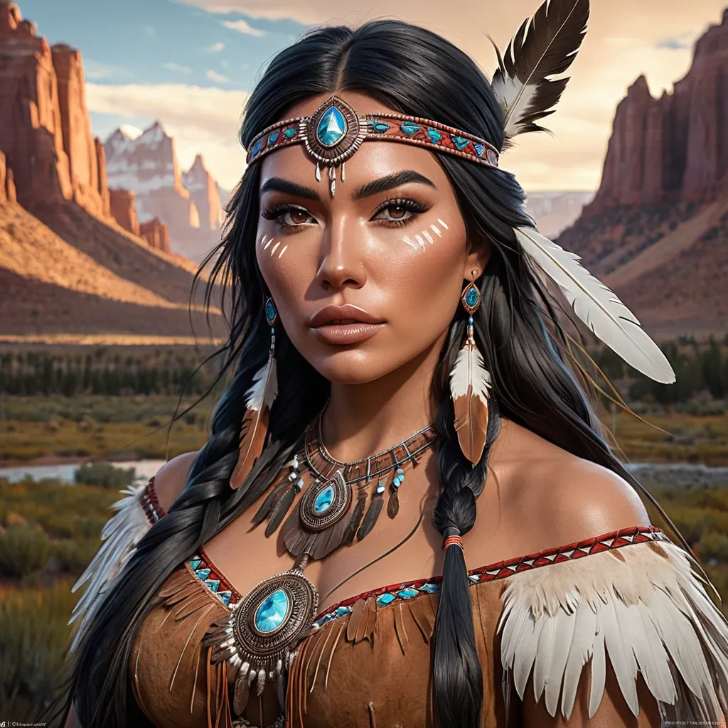 mdjrny-v4 style portrait photograph of Madison Beer as Pocahontas , young beautiful native american woman , perfect symmetrical face , feather jewelry , traditional handmade dress , armed female hunter warrior , (((wild west))) environment , Utah landscape , ultra realistic , concept art , elegant , ((intricate)) , ((highly detailed)) , depth of field , ((professionally color graded)) , 8k , art by artgerm and greg rutkowski and alphonse mucha ,