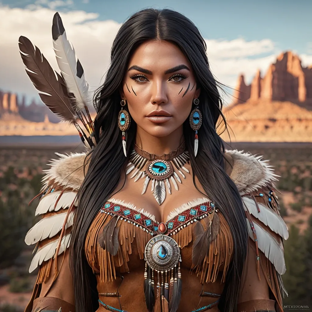 full body portrait photograph of Madison Beer as Pocahontas , young beautiful native american woman , perfect symmetrical face , feather jewelry , traditional handmade dress , armed female hunter warrior , (((wild west))) environment , Utah landscape , ultra realistic , concept art , elegant , ((intricate)) , ((highly detailed)) , depth of field , ((professionally color graded)) , 8k , art by artgerm and greg rutkowski and alphonse mucha , 4k , clean , realistic face , realistic eyes , highest quality , realistic hands , trending on artstation , masterpiece , NSFW , five fingers , make her sexy and hot ,