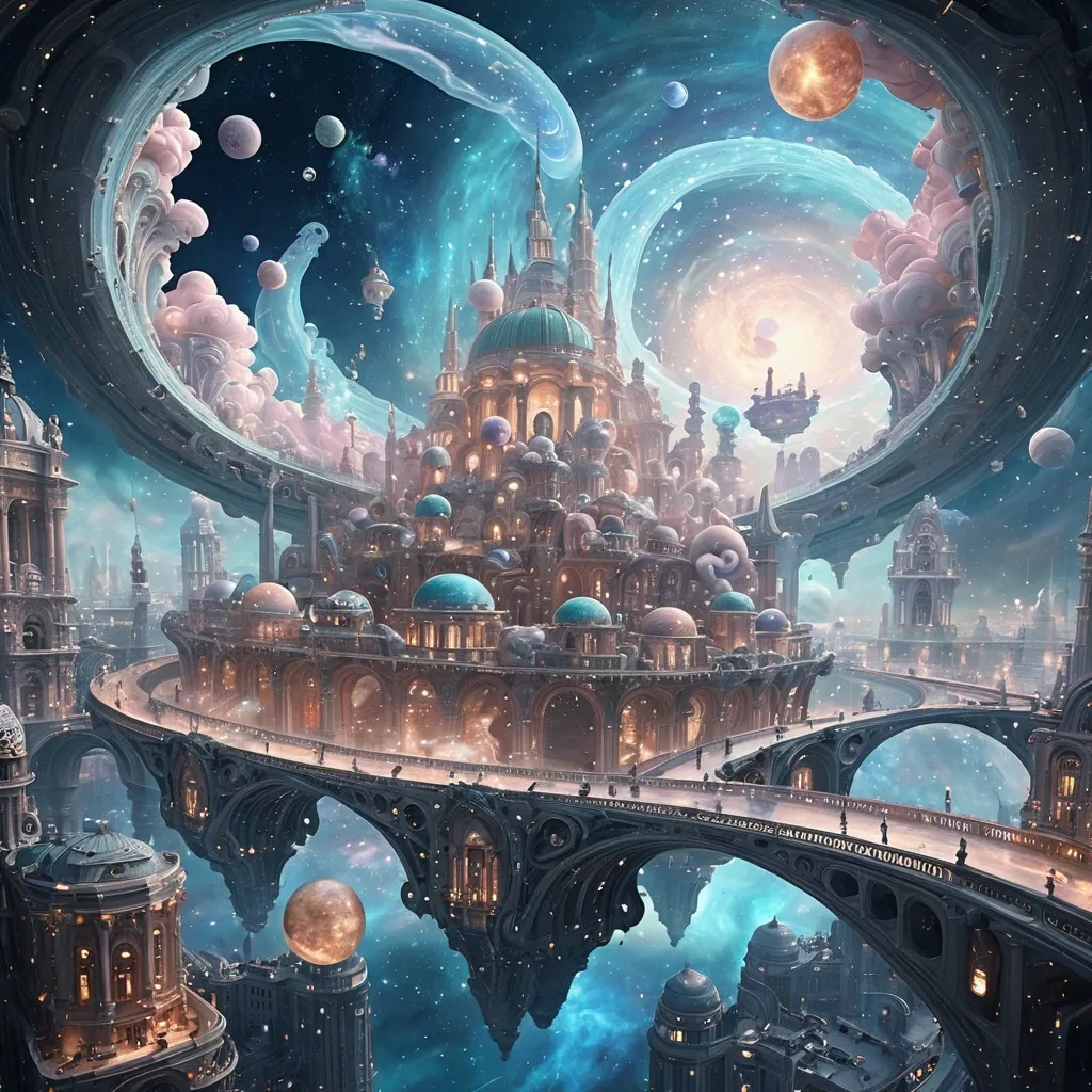 A whimsical , surreal cityscape where buildings are constructed from giant , swirling nebulae and constellations , all under a dominant , Masterpiece Galaxy Wordie Universal Academia. Floating islands with baroque-style architecture are connected by bridges of pure light. Ethereal , translucent figures inhabit this dreamlike metropolis. The style is a blend of surrealism and hyperrealism , with an artistic sensibility that captures the awe of a grand cosmic vista. ,
