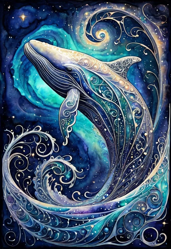 The 'Masterpiece Monday' prompt: A majestic whale , rendered in intricate , almost filigree-like detail , swims through a cosmic ocean where stars are replaced by glowing pearls and nebulae swirl like watercolor washes. The whale's form subtly abstracts into swirling patterns of light and color , evoking a sense of infinite , interconnected consciousness. ,