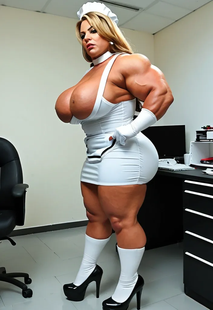 Plan de profil de Very giant curvy bbw bimbo muscular most amazing busty chubby maid lady with too big implants breast , enormous ass , bbw muscular enormous bimbo powerlifteuse , abnormally massive female muscular bodybuilder , bbw , Giant maid lady in heels , very big ass , curvacious , gorgeous , Madonna face , flexing in front of officer in a narrow office at evening , wearing a white apron dress , gros seins en évidence , gros biceps énormes , biggest ass , cuisses en évidence , portant des talons , make up , mini latex gloves , vue de profil ,
