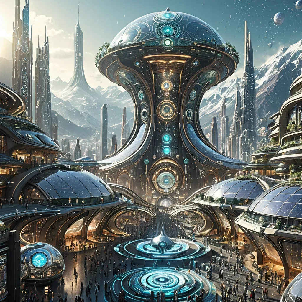 A urban scene in 2059: Futuristic Solarpunk city with Skylines , illuminated spiral skyscrapers and a large solar panel dome at the top , in a streets are filled with people in advanced , tech-inspired clothing surrounded by mountains covered with sparkling mucilage droplets , ornate organic looking art nouveau inspired structures with solar-panel glass , nature and technology in harmony. ,