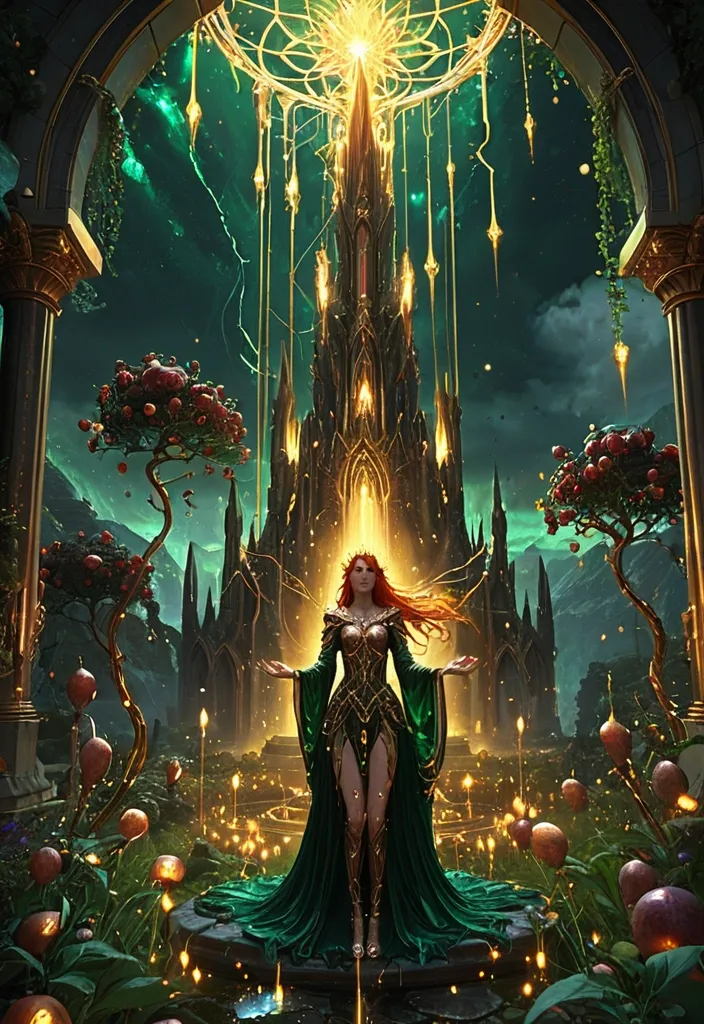 **Masterpiece digital painting , epic fantasy art. Central towering crystal spire exploding with golden lightning ) , shattering black chains in mid-air. Below , a lush , glowing garden of flora with pomegranate trees and luminous flowers. A serene brrzhtsking beauty celtic redhead queen on her knees in the garden , one hand touching the earth , the other catching falling stars. Style of Amano's elegance and Greg Rutkowski's depth. Color palette: Emerald green , deep violet , celestial gold , and volcanic orange. Hyperdetailed , mystical atmosphere , divine light rays , 8K , cinematic composition.** octane render epic masterpiece ,