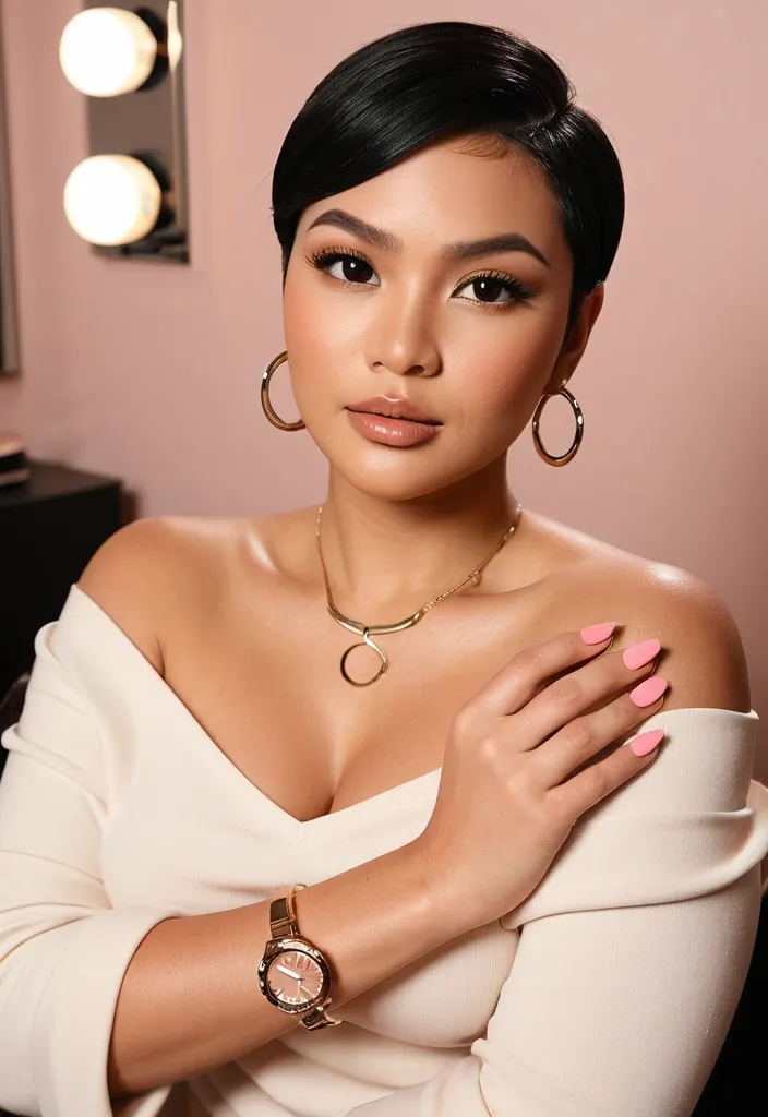 Philippine woman with black hair is styled in a sleek , short pixie cut — smooth , glossy , and expertly shaped so it frames her face with razor-clean precision. The front has a soft swoop that brings attention to her eyes , while the rest is cropped tight and polished , giving her a modern , sophisticated edge. It’s the kind of cut that says she knows exactly who she is and doesn’t need a single extra curl to prove it.Her face is warm-toned and beautifully sculpted , with full lips , bold lashes , and eyeshadow that brings out the natural almond shape of her eyes. She has the kind of expression that sits right between confidence and calm — the “I’m in charge , but I’m not raising my voice” look. Her earrings and makeup pull the whole face together with a smooth , glamorous finish.Her body is soft-curvy and feminine , with relaxed posture that shows comfort and assurance in her own skin. She wears a loose off-the-shoulder long-sleeve top paired with gold accessories that pop against her skin — hoop earrings , layered necklaces , and a bold gold watch stacked with bracelets. Long , glossy pink nails extend from her fingers , effortlessly adding style and personality.The scene around her is a cozy , warm salon-style setting , with nail tools and polish in the foreground , highlighting the environment she’s in. Soft lighting and muted tones create a calm , inviting atmosphere , making it feel like a place where people go to unwind , get pampered , and catch a breath. She sits there confidently , looking like the person everyone trusts to make them look their best. Enormous Breast , ,