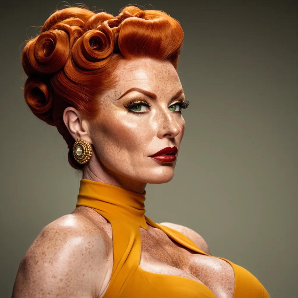1940s , Generate Gorgeous female boss , bimbo , hourglass body , abnormally massive female bodybuilder , gorgeous , close up , full lips , big booty , redheaded , 34 years-old , freckles on face and breast , 1940s designed hair , updo design hair , baby hair curls sides-burns , feminine silhouette , too big breast , big booty , sexy thighs abs , silhouette , up close , flexing biceps , beautiful green eyes , legs are iconic and defining physical feature , both visually and in terms of combat ability.wearing an outfit that is a striking blend of elegance , power , and femininity , designed to command attention in any room. The suit is tailored to perfection , hugging the wearer’s curves with precision while emphasizing a structured silhouette. The fabric itself is a refined grey tweed patterned with subtle white grid lines , giving the suit a texture that feels both sophisticated and modern. The blazer features broad blue lapels and gold button accents , adding a luxurious touch that elevates the look beyond typical business attire. The matching high-waisted trousers elongate the frame , further enhancing the poised and commanding effect of the ensemble.The styling choices amplify the boldness of the suit. The inner blouse is a silky , greybutton-down shirt that complements the tweed’s tone while introducing a softer , feminine balance to the sharp tailoring of the jacket. The blouse peeks out neatly from under the blazer , maintaining elegance without drawing focus away from the suit’s commanding cut. Accessories are kept minimal yet intentional: a delicate layered gold necklace and hoop earrings that add glimmers of light and luxury without overpowering the outfit. The choice of voluminous , honey-brown braids cascading down her shoulders frames the face with both confidence and glamour , completing the commanding visual.Altogether , this look communicates a blend of authority and allure. It is ready yet fashion-forward , balancing corporate structure with vibrant femininity. The color palette mustard yellow , burnt orange and cream avoids being overly delicate , instead embracing the richness of texture , structure , and presence. This is the kind of ensemble that speaks to ambition , sophistication , and personal style—ideal for someone who thrives in positions of influence but insists on expressing her individuality with bold elegance. It’s not just clothing—it’s a statement of power wrapped in grace. Freckles , Light reflecting green eyes , short fingnernails , massive breast , enormous butt , powerful hourglass silhouette , ,