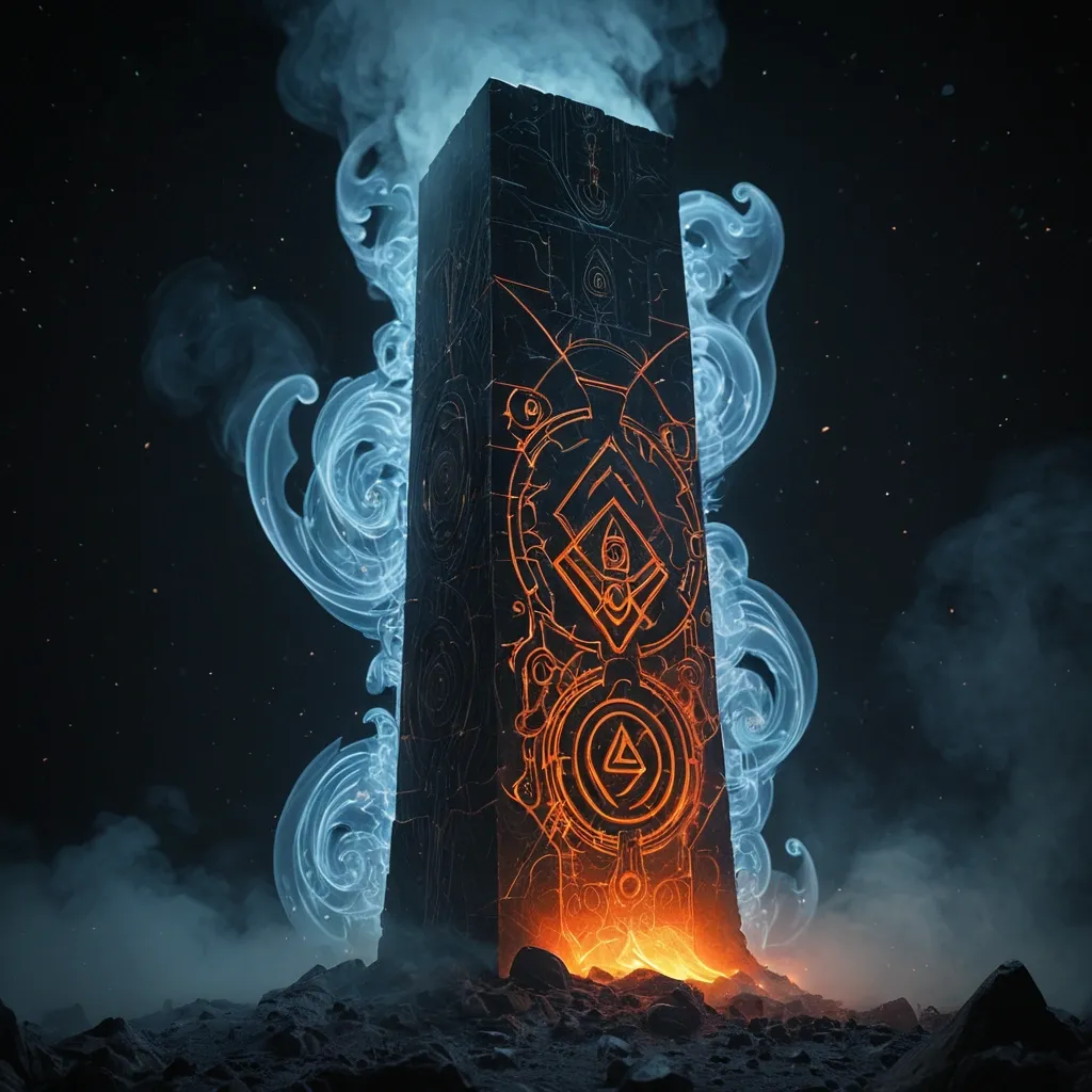 A towering (arcanely glowing monolith-cylinder) , its obsidian surface densely carved with pulsating runes and glyphs in an unknown celestial language , floats at the precipice of a (gravitationally distorted event triangle) , where spacetime fractures into spiraling smoke-tendrils that coil but never cross the threshold. At its base , a (deliberately poised humanoid AI driver) , their chrome-plated fingers extended toward the bending smoke-edge , their joints humming with restrained energy , their faceless visage reflecting the void’s inverted light. The Hindi symbol "🕉" burns neon-orange against their chestplate , its glow casting jagged shadows across the monolith’s runes. Behind them , the void yawns in impossible fractal scales—nebulas crushed into geometric patterns , distant stars stretched into razor-thin event lines. Volumetric lighting cascades from an unseen cosmic source , diffracting through the smoke into prismatic shards that etch the scene with a (hyperrealistic yet dreamlike luminosity). Shot on a 120mm macro lens at f/1.2 , depth of field razor-thin to isolate the AI’s finger from the warping background , motion blur applied only to the smoke’s languid curl. ,