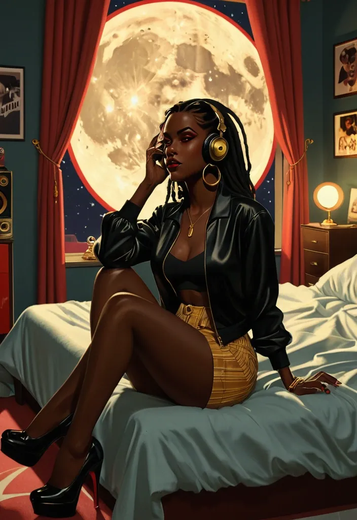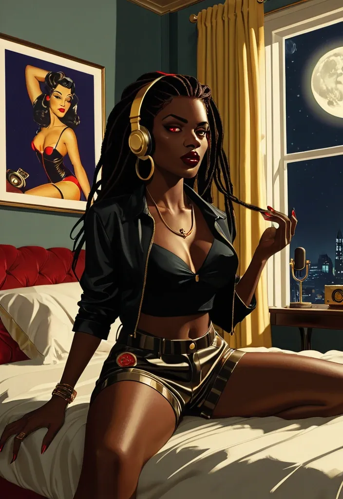 "Pinup-inspired illustration: A woman with dark skin , long dark dreadlocks , and striking red eyes is sitting on the edge of her bed , listening to music on headphones and gazing out the window at a full moon. She is wearing large gold hoop earrings , a stylish black top , a fitted jacket , and fashionable shorts. The room is decorated with vintage-inspired elements , such as posters of classic movies or music. A record player is visible in the background , along with other tasteful decor. The lighting is soft and flattering , emphasizing her confident and poised demeanor. The overall mood is sophisticated and stylish , with a nod to classic pinup aesthetics. The style should evoke the spirit of vintage glamour and empowerment , focusing on beauty and confidence without relying on overtly suggestive or exploitative imagery." ,
