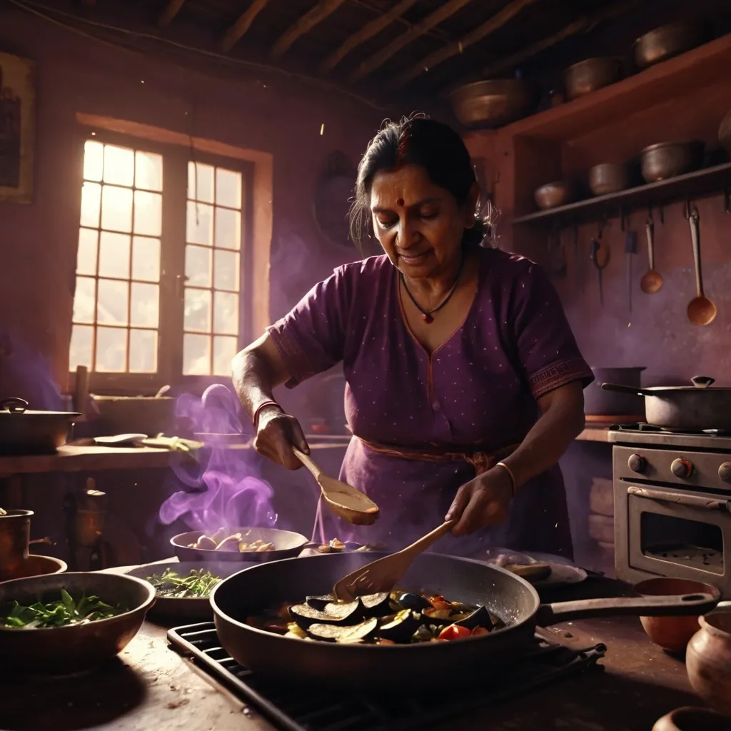 Bring to life a vibrant and whimsical animation in a hand-drawn style. A yIndian middle-aged poor woman cooking eggplant stir-fried with wild betel potato in a traditional kitchen. She is holding a wooden spatula , gently stirring Potatos slices mixed with slices of tomatoes and purple Brinjal in a black iron pan over a gas stove. Natural warm lighting , steam rising , rustic Indian kitchen background. The animation should feel light , joyful , and full of gentle charm. High motion , cinematic tracking video shot , the camera moving dynamically forward , epic cinematic video shot , ultra detailed cinematic , , epic wide shot , IMAX film camera , cinematic frame lens , cinematic wide shot , warm and dreamy tones , inspired by romanticism , (exquisitely beautiful) , cinematic , (gorgeous) , insane details , 8K , UHD , (brilliant composition) , cinematic pace. movements are bold , intense atmosphere , 32k , dramatic composition ,