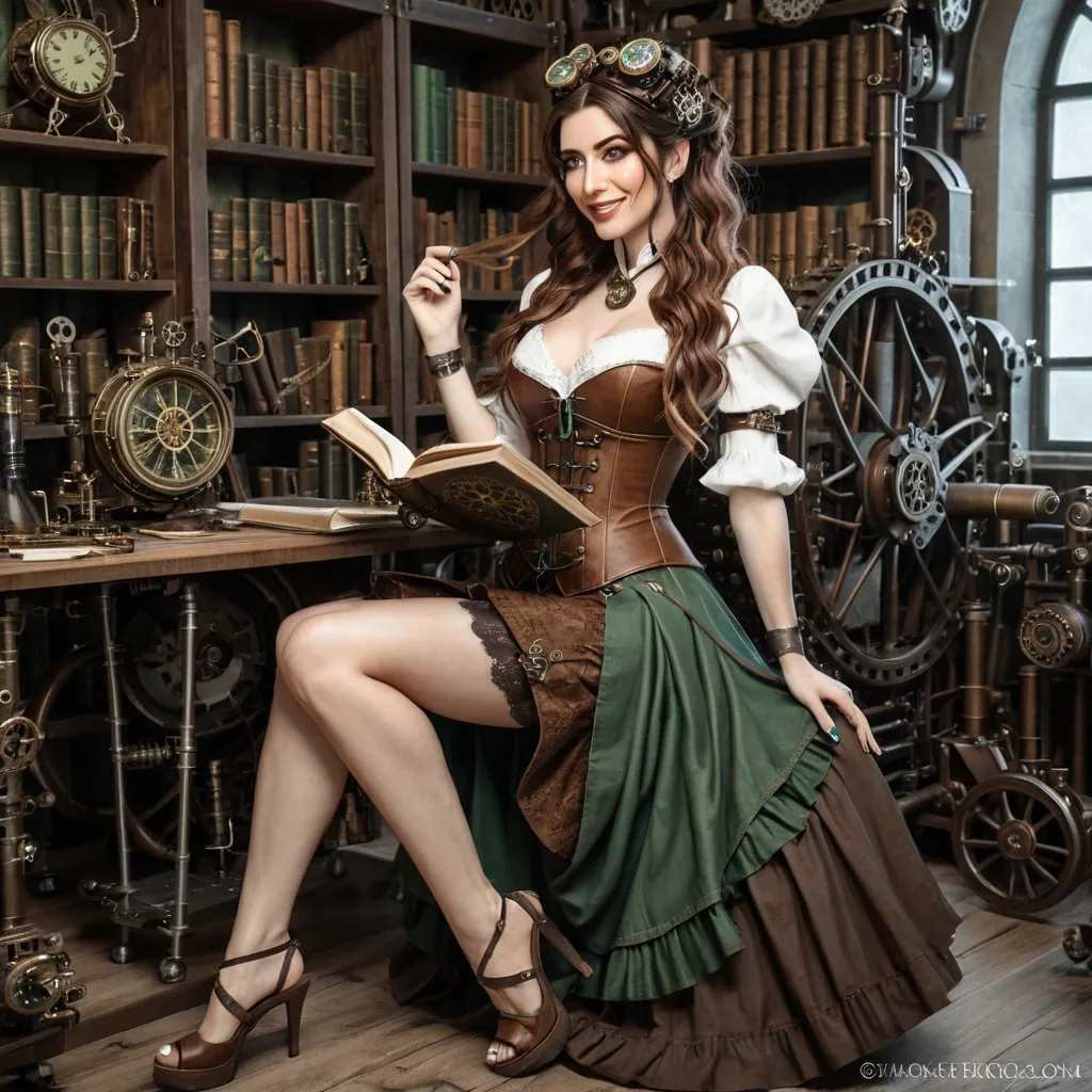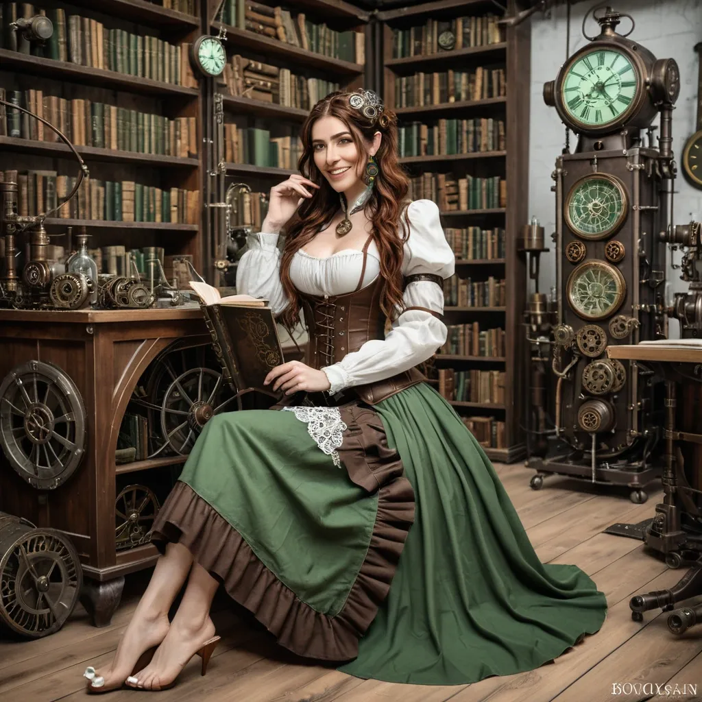 Photo realistic full lenght white steampunk open lace shirt , brown corset with clockworks parts , green openside wrap skirt , barefoot , long brown wavy hair a bronze hair clip white pale freckled 30yo european woman with little bronze hair clip , she sitting a hand on her hair and steampunk book in the other , she is in a steampunk laboratory full of book and machinery she have a little smile ,