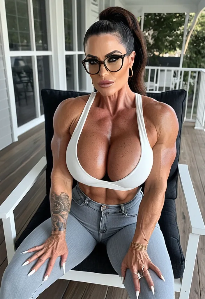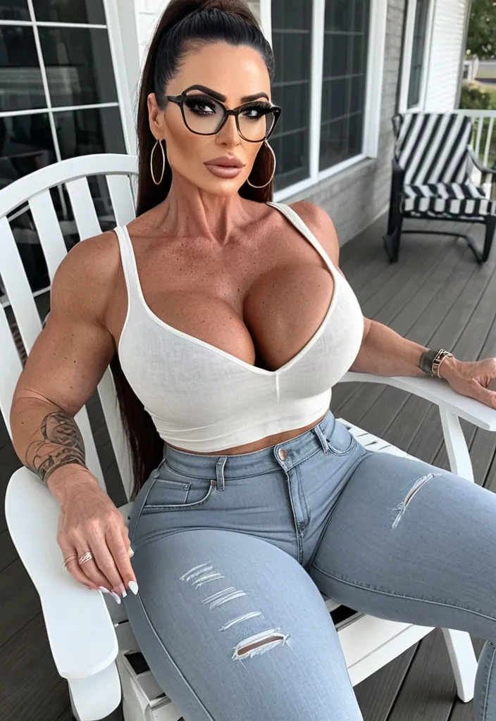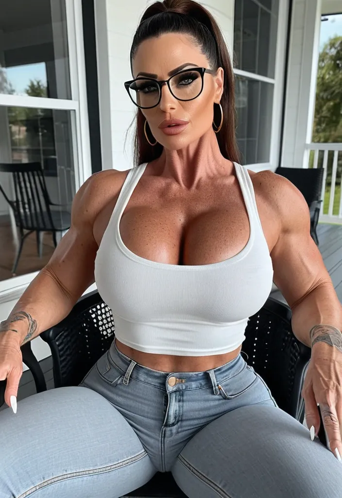Generate Gorgeous 38 years old , female boss , Caucasian woman , bimbo , hourglass body , abnormally massive female bodybuilder , gorgeous , close up , full lips , big booty , brunette , freckles eye glasses , updo , shaved on the side , bangs , , feminine silhouette , too big breast , big booty , sexy thighs abs , silhouette , up close , flexing biceps , beautiful brown eyes , legs are iconic and defining physical feature , both visually and in terms of combat ability.wearing an outfit that is a striking blend of elegance , power , and femininity , designed to command attention in any room. The suit is tailored to perfection , hugging the wearer’s curves with precision while emphasizing a structured silhouette. The fabric itself is a refined grey tweed patterned with subtle white grid lines , giving the suit a texture that feels both sophisticated and modern. The blazer features broad blue lapels and gold button accents , adding a luxurious touch that elevates the look beyond typical business attire. The matching high-waisted trousers elongate the frame , further enhancing the poised and commanding effect of the ensemble.The styling choices amplify the boldness of the suit. The inner blouse is a silky , greybutton-down shirt that complements the tweed’s tone while introducing a softer , feminine balance to the sharp tailoring of the jacket. The blouse peeks out neatly from under the blazer , maintaining elegance without drawing focus away from the suit’s commanding cut. Accessories are kept minimal yet intentional: a delicate layered gold necklace and hoop earrings that add glimmers of light and luxury without overpowering the outfit. The choice of voluminous , honey-brown braids cascading down her shoulders frames the face with both confidence and glamour , completing the commanding visual.Altogether , this look communicates a blend of authority and allure. It is business-ready yet fashion-forward , balancing corporate structure with vibrant femininity. The color palette blue , grey and gold avoids being overly delicate , instead embracing the richness of texture , structure , and presence. This is the kind of ensemble that speaks to ambition , sophistication , and personal style—ideal for someone who thrives in positions of influence but insists on expressing her individuality with bold elegance. It’s not just clothing—it’s a statement of power wrapped in grace. In luxury living legs that could crush a watermelon , skirt high boots are a bold and striking statement piece , crafted in glossy black patent leather that gives them a sleek , polished finish. Rising to just below the knee , the boots feature three adjustable buckle straps along the shaft , adding both edge and detail to their design. The towering stiletto heel , paired with a thick platform sole , creates an ultra-dramatic silhouette that elongates the leg and exudes power and confidence. With their combination of shine , height , and structure , these boots perfectly balance fierce femininity with high-fashion allure. High cheekbones , prominent jawline , gorgeous big brown eyes , freckles , enormous breast , grey denim pants , white tank top sitting on back porch on porch chair , drinking coffee , gorgeous brown eyes , denim jacket , enormous butt ,