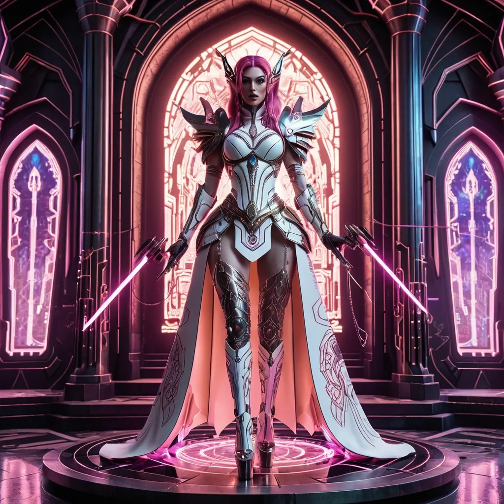 Portrait of A captivating character scene featuring a stylised a beauty battle angel with pink colored hair with strands and Makeupaugmenting , stands by a elven holographic projections machine with intricate details and displays vintage , In a futuristic setting. The character is dressed in a cape and futuristic elegant white and golden porcelain armor , leather skirt with chains and stylised elements , adorned with elven designs and elegant outcuts , holding a futuristic axe with glowing plasma edges , intricate details and outcuts , display for plasma power and tube enhancing the youthful and trendy vibe (style:1.2). intricate patterns , while chunky platform shoes add a touch of urban flair. The setting is illuminated by a dramatic , ambient lighting , with a epic highlights around the temple area and a sunset view through large temple windows , casting an inviting glow (lighting:1.2). Emphasize details like the layered hair , which transitions from dark to purple (hair:1.2) , and accessories reflecting a personal style , such as earrings and hairpins. Focus on capturing the body language that conveys a sense of confidence and intrigue , while avoiding any distractions like excessive clutter or sharp angles (negative aspects:1.2). Ensure the character's appearance is crisp and vibrant , optimizing textures for the stable diffusion platform (high-detail:1.2). Floating steam and energy glowing , ,