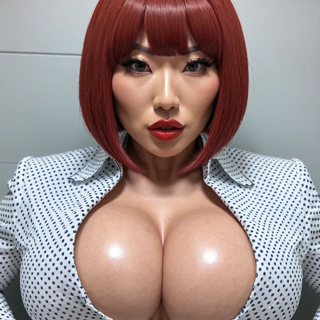Generate Gorgeous female boss , 34 years old , Japanese woman , pointy face , bimbo , hourglass body , abnormally massive female bodybuilder , gorgeous , close up , full lips , big booty , red hair breast , short bob-cut , bangs cover forhead design hair , feminine silhouette , too big breast , big booty , sexy thighs abs , silhouette , up close , flexing biceps , beautiful green eyes , legs are iconic and defining physical feature , both visually and in terms of combat ability.wearing an outfit that is a striking blend of elegance , power , and femininity , designed to command attention in any room. The suit is tailored to perfection , hugging the wearer’s curves with precision while emphasizing a structured silhouette. The fabric itself is a refined grey tweed patterned with subtle white grid lines , giving the suit a texture that feels both sophisticated and modern. The blazer features broad blue lapels and gold button accents , adding a luxurious touch that elevates the look beyond typical business attire. The matching high-waisted trousers elongate the frame , further enhancing the poised and commanding effect of the ensemble.The styling choices amplify the boldness of the suit. The inner blouse is a silky , greybutton-down shirt that complements the tweed’s tone while introducing a softer , feminine balance to the sharp tailoring of the jacket. The blouse peeks out neatly from under the blazer , maintaining elegance without drawing focus away from the suit’s commanding cut. Accessories are kept minimal yet intentional: a delicate layered gold necklace and hoop earrings that add glimmers of light and luxury without overpowering the outfit. The choice oframes the face with both confidence and glamour , completing the commanding visual.Altogether , this look communicates a blend of authority and allure. It is business-ready yet fashion-forward , balancing corporate structure with vibrant femininity. The color palette blue , grey and gold avoids being overly delicate , instead embracing the richness of texture , structure , and presence. This is the kind of ensemble that speaks to ambition , sophistication , and personal style—ideal for someone who thrives in positions of influence but insists on expressing her individuality with bold elegance. It’s not just clothing—it’s a statement of power wrapped in grace. In luxury living legs that could crush a watermelon , skirt high boots are a bold and striking statement piece , crafted in glossy black patent leather that gives them a sleek , polished finish. Rising to just below the knee , the boots feature three adjustable buckle straps along the shaft , adding both edge and detail to their design. The towering stiletto heel , paired with a thick platform sole , creates an ultra-dramatic silhouette that elongates the leg and exudes power and confidence. With their combination of shine , height , and structure , these boots perfectly balance fierce femininity with high-fashion allure. Gorgeous brown eyes , big lips glossy lips , enormous breast , enormous butt , up close shot , white and blue pin-dot dress shirt ,
