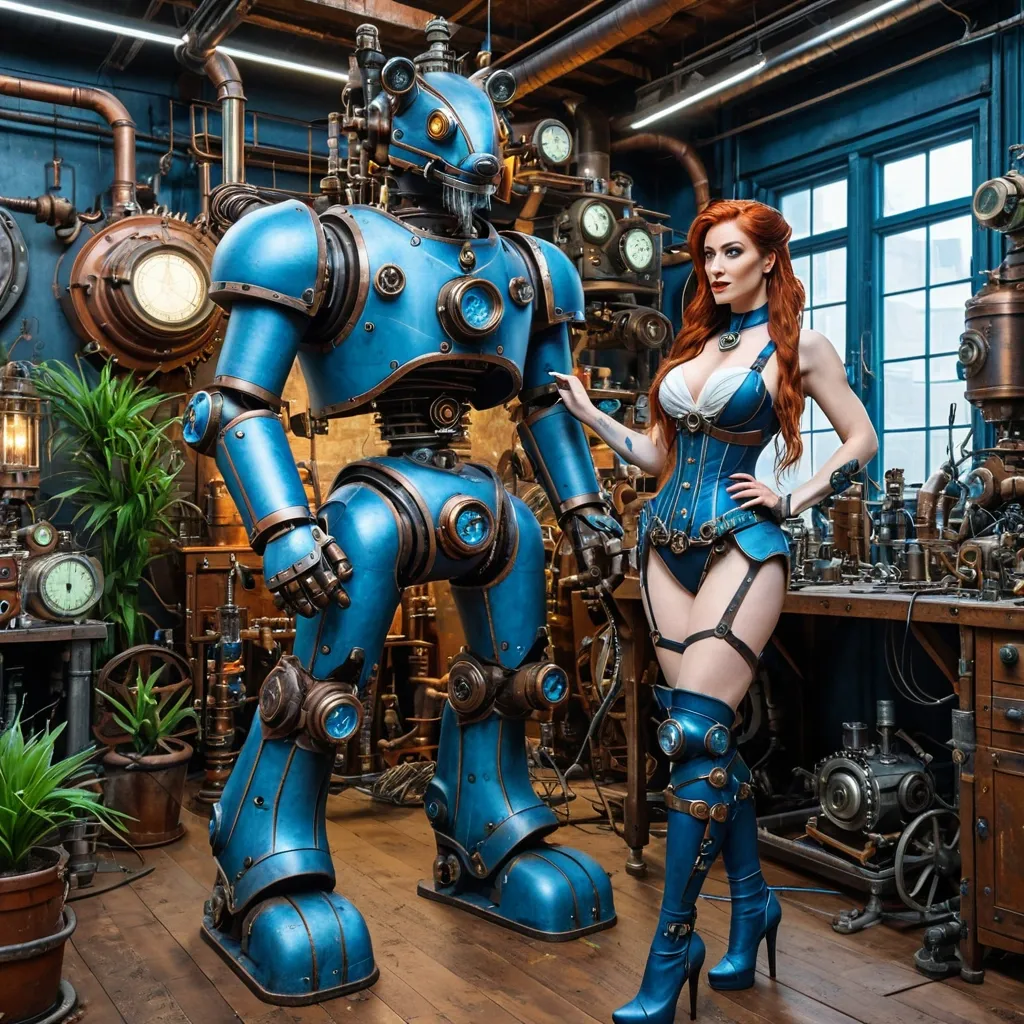 Masterpiece photorealistic full-length of a 21-year-old braid redhead girl with gogle in mechanical steampunk suit blue and white is standing up ahand on her hip and looking at a cute bronze and blue steampunk giant mechanical cat robot. In a coloured steampunk workshop a lot of broken old machinery all over the place , wall gaslight. A little green plant in the room. She tests out her new cock-milking machine on 40 year old man with dark long hair and beard ,