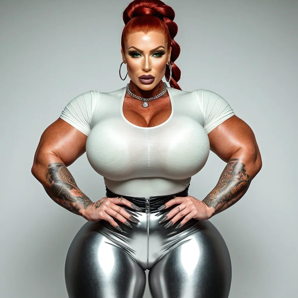 Generate Gorgeous female boss , bimbo , hourglass body , abnormally massive female bodybuilder , gorgeous , close up , full lips , big booty , redheaded , freckles on face and breast , braided design hair , feminine silhouette , too big breast , big booty , sexy thighs abs , silhouette , up close , flexing biceps , beautiful green eyes , legs are iconic and defining physical feature , both visually and in terms of combat ability.wearing an outfit that is a striking blend of elegance , power , and femininity , designed to command attention in any room. The suit is tailored to perfection , hugging the wearer’s curves with precision while emphasizing a structured silhouette. The fabric itself is a refined grey tweed patterned with subtle white grid lines , giving the suit a texture that feels both sophisticated and modern. The blazer features broad blue lapels and gold button accents , adding a luxurious touch that elevates the look beyond typical business attire. The matching high-waisted trousers elongate the frame , further enhancing the poised and commanding effect of the ensemble.The styling choices amplify the boldness of the suit. The inner blouse is a silky , greybutton-down shirt that complements the tweed’s tone while introducing a softer , feminine balance to the sharp tailoring of the jacket. The blouse peeks out neatly from under the blazer , maintaining elegance without drawing focus away from the suit’s commanding cut. Accessories are kept minimal yet intentional: a delicate layered gold necklace and hoop earrings that add glimmers of light and luxury without overpowering the outfit. The choice of voluminous , honey-brown braids cascading down her shoulders frames the face with both confidence and glamour , completing the commanding visual.Altogether , this look communicates a blend of authority and allure. It is business-ready yet fashion-forward , balancing corporate structure with vibrant femininity. The color palette blue , grey and gold avoids being overly delicate , instead embracing the richness of texture , structure , and presence. This is the kind of ensemble that speaks to ambition , sophistication , and personal style—ideal for someone who thrives in positions of influence but insists on expressing her individuality with bold elegance. It’s not just clothing—it’s a statement of power wrapped in grace. In luxury living legs that could crush a watermelon , skirt high boots are a bold and striking statement piece , crafted in glossy black patent leather that gives them a sleek , polished finish. Rising to just below the knee , the boots feature three adjustable buckle straps along the shaft , adding both edge and detail to their design. The towering stiletto heel , paired with a thick platform sole , creates an ultra-dramatic silhouette that elongates the leg and exudes power and confidence. With their combination of shine , height , and structure , these boots perfectly balance fierce femininity with high-fashion allure. Freckles gorgeous green eyes , eggshell white elegant classy velvet t-shirt and silver necklace , black leather pants , enormous butt , curvy hips , stacked hourglasses silhouette ,