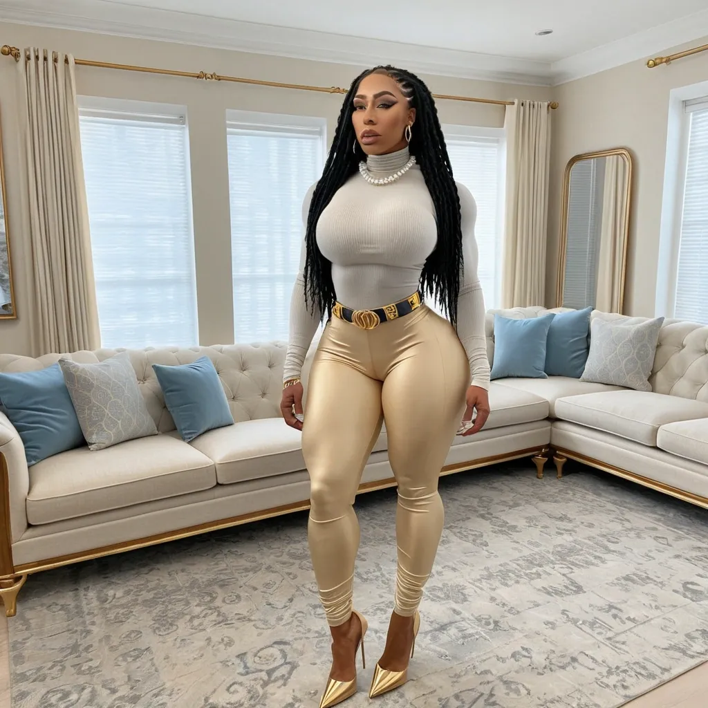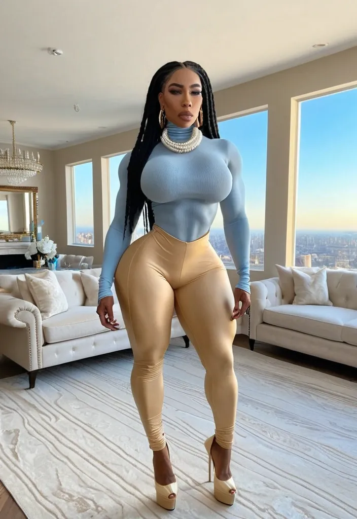 24 years old , Light-skinned African-American woman — extremely beautiful , with a presence that feels quietly dangerous and quietly royal at the same time. She has that soft glow in her skin that looks effortless , like she wakes up looking like this every day without trying , but everyone knows she still probably puts in discipline the old fashioned way. Her bone structure is model tier… cheekbones that could cut through pride , a jawline that says she doesn’t bend for just anybody , and soft lips that hold mystery and restraint all at once.Her short locs is cropped close , styled in textured waves that shape her face like an artist’s finishing brush stroke. It gives her a striking , modern elegance — feminine , but with that slight edge that tells you she’s not the type anyone ever controls. Her eyebrows are naturally bold and shaped sharply , framing her icy blue eyes that practically glow with their own weather system. Those eyes… you could lose a fight in those eyes before she ever speaks a word.She has luminous , glossy skin that reflects light like polished bronze catching early morning sun. Natural freckles sprinkle just lightly across her cheeks , softening the intimidation factor with a hint of youthful innocence. The way the light hits her face makes her look sculpted — like an ultra realistic painting brought to life. Everything about her looks intentional… but also like she was born this way.There’s also this quiet calm in her expression — not emotional weakness — but a poised , unshakeable stillness that only comes from knowing exactly who you are and not needing to defend it. She looks like the woman who never rushes into noise… she waits , she observes , she lets the room shift around her while she remains unmoved. That alone is power — and she wears it naturally like an old soul who understands her worth in ways other people are still scrambling to figure out , blonde short short dreadlocks hair , beige and sky blue silk bodysuit , diamond gotti necklace , muscular body builder woman , abnormally massive woman , enormous breast , enormous butt , turtleneck , pearl white closed collar , crew neck top. in beautiful living room , gold pants ,