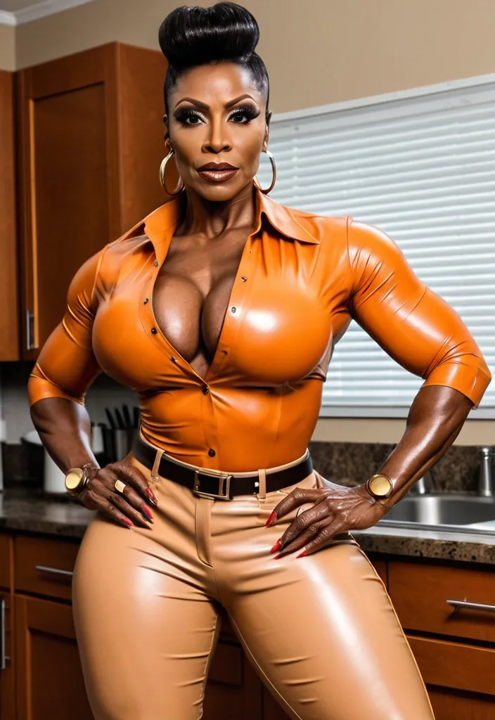 42 years old , dark-skinned African-American woman — extremely beautiful , with a presence that feels quietly dangerous and quietly royal at the same time. She has that soft glow in her skin that looks effortless , like she wakes up looking like this every day without trying , but everyone knows she still probably puts in discipline the old fashioned way. Her bone structure is model tier… cheekbones that could cut through pride , a jawline that says she doesn’t bend for just anybody , and soft lips that hold mystery and restraint all at once.Her futuristic hairdo , cropped close , styled in textured waves that shape her face like an artist’s finishing brush stroke. It gives her a striking , modern elegance — feminine , but with that slight edge that tells you she’s not the type anyone ever controls. Her eyebrows are naturally bold and shaped sharply , framing her honey hazel eyes that practically glow with their own weather system. Those eyes… you could lose a fight in those eyes before she ever speaks a word.She has luminous , glossy skin that reflects light like polished bronze catching early morning sun. Natural freckles sprinkle just lightly across her cheeks , softening the intimidation factor with a hint of youthful innocence. The way the light hits her face makes her look sculpted — like an ultra realistic painting brought to life. Everything about her looks intentional… but also like she was born this way.There’s also this quiet calm in her expression — not emotional weakness — but a poised , unshakeable stillness that only comes from knowing exactly who you are and not needing to defend it. She looks like the woman who never rushes into noise… she waits , she observes , she lets the room shift around her while she remains unmoved. That alone is power — and she wears it naturally like an old soul who understands her worth in ways other people are still scrambling to figure out , blonde short short futuristic pompadour hair , muscular body builder woman , , enormous breast , enormous buttThe low-cut top emphasizes her posture , drawing attention to her chest as she gazes directly ahead. standing in kitchen , enormous butt , , Enormous breast , facing camera , modest top , button up shirt , closed collar , modest collar orange , brown , and beige accent modest shirt , beige leather pants , closed collar top ,