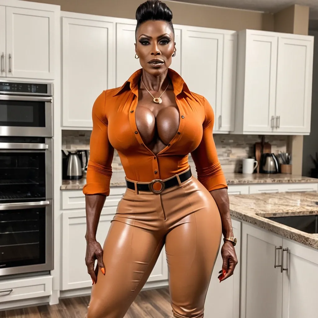 42 years old , dark-skinned African-American woman — extremely beautiful , with a presence that feels quietly dangerous and quietly royal at the same time. She has that soft glow in her skin that looks effortless , like she wakes up looking like this every day without trying , but everyone knows she still probably puts in discipline the old fashioned way. Her bone structure is model tier… cheekbones that could cut through pride , a jawline that says she doesn’t bend for just anybody , and soft lips that hold mystery and restraint all at once.Her futuristic hairdo , cropped close , styled in textured waves that shape her face like an artist’s finishing brush stroke. It gives her a striking , modern elegance — feminine , but with that slight edge that tells you she’s not the type anyone ever controls. Her eyebrows are naturally bold and shaped sharply , framing her honey hazel eyes that practically glow with their own weather system. Those eyes… you could lose a fight in those eyes before she ever speaks a word.She has luminous , glossy skin that reflects light like polished bronze catching early morning sun. Natural freckles sprinkle just lightly across her cheeks , softening the intimidation factor with a hint of youthful innocence. The way the light hits her face makes her look sculpted — like an ultra realistic painting brought to life. Everything about her looks intentional… but also like she was born this way.There’s also this quiet calm in her expression — not emotional weakness — but a poised , unshakeable stillness that only comes from knowing exactly who you are and not needing to defend it. She looks like the woman who never rushes into noise… she waits , she observes , she lets the room shift around her while she remains unmoved. That alone is power — and she wears it naturally like an old soul who understands her worth in ways other people are still scrambling to figure out , blonde short short futuristic pompadour hair , muscular body builder woman , , enormous breast , enormous buttThe low-cut top emphasizes her posture , drawing attention to her chest as she gazes directly ahead. standing in kitchen , enormous butt , , Enormous breast , facing camera , modest top , button up shirt , closed collar , modest collar orange , brown , and beige accent modest shirt , beige leather pants , closed cleavage ,