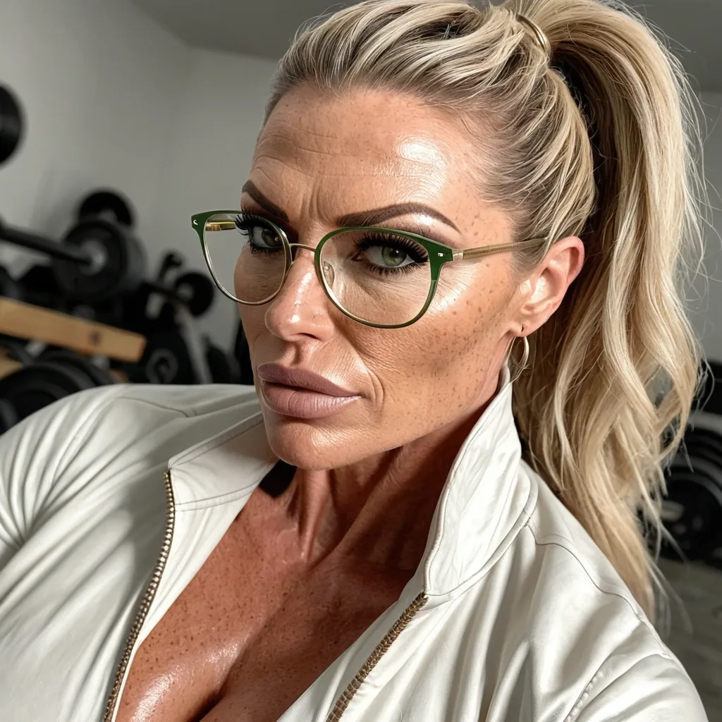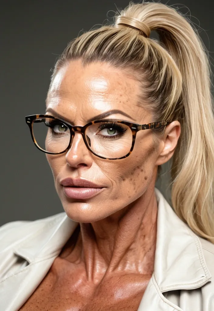 42 years old , Generate Gorgeous female physical fitness trainer , bimbo , circle eye glasses hourglass body , abnormally massive female bodybuilder , gorgeous , close up , full lips , big booty , hair in ponytail , freckles , dirty blonde hair , short hair feminine silhouette , too big breast , big booty , sexy thighs abs , silhouette , up close , flexing biceps , gorgeous light brown eyes , legs are iconic and defining physical feature , both visually and in terms of combat ability.wearing an outfit that is a striking blend of elegance , power , and femininity , designed to command attention in any room. The suit is tailored to perfection , hugging the wearer’s curves with precision while emphasizing a structured silhouette. The fabric itself is a refined grey tweed patterned with subtle white grid lines , giving the suit a texture that feels both sophisticated and modern. The blazer features broad blue lapels and gold button accents , adding a luxurious touch that elevates the look beyond typical business attire. The matching high-waisted trousers elongate the frame , further enhancing the poised and commanding effect of the ensemble.The styling choices amplify the boldness of the suit. The inner blouse is a silky , greybutton-down shirt that complements the tweed’s tone while introducing a softer , feminine balance to the sharp tailoring of the jacket. The blouse peeks out neatly from under the blazer , maintaining elegance without drawing focus away from the suit’s commanding cut. Accessories are kept minimal yet intentional: a delicate layered gold necklace and hoop earrings that add glimmers of light and luxury without overpowering the outfit. The choice of voluminous , honey-brown braids cascading down her shoulders frames the face with both confidence and glamour , completing the commanding visual.Altogether , this look communicates a blend of authority and allure. It is business-ready yet fashion-forward , balancing corporate structure with vibrant femininity. The color palette blue , grey and gold avoids being overly delicate , instead embracing the richness of texture , structure , and presence. This is the kind of ensemble that speaks to ambition , sophistication , and personal style—ideal for someone who thrives in positions of influence but insists on expressing her individuality with bold elegance. It’s not just clothing—it’s a statement of power wrapped in grace. In luxury living legs that could crush a watermelon , skirt high boots are a bold and striking statement piece , crafted in glossy black patent leather that gives them a sleek , polished finish. Rising to just below the knee , the boots feature three adjustable buckle straps along the shaft , adding both edge and detail to their design. The towering stiletto heel , paired with a thick platform sole , creates an ultra-dramatic silhouette that elongates the leg and exudes power and confidence. With their combination of shine , height , and structure , these boots perfectly balance fierce femininity with high-fashion allure. High cheekbones , prominent jawline , dirty blonde , gorgeous big light reflecting light gorgeous brown eyes , green eyes , freckles , white collard cloth jacket , beige t-shirt , denim jeans ,