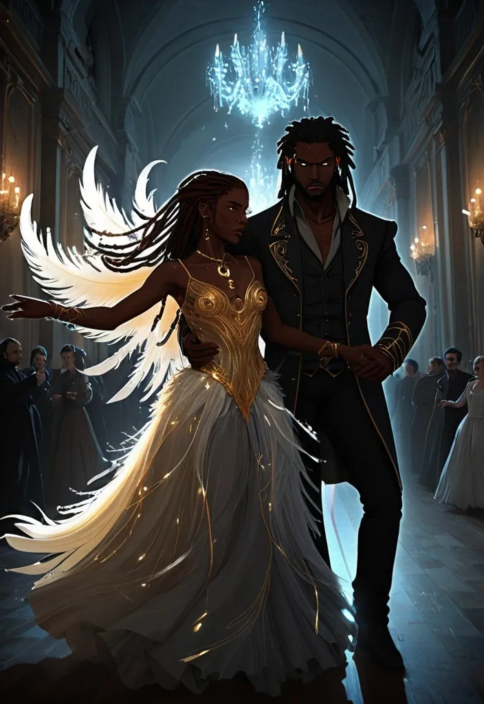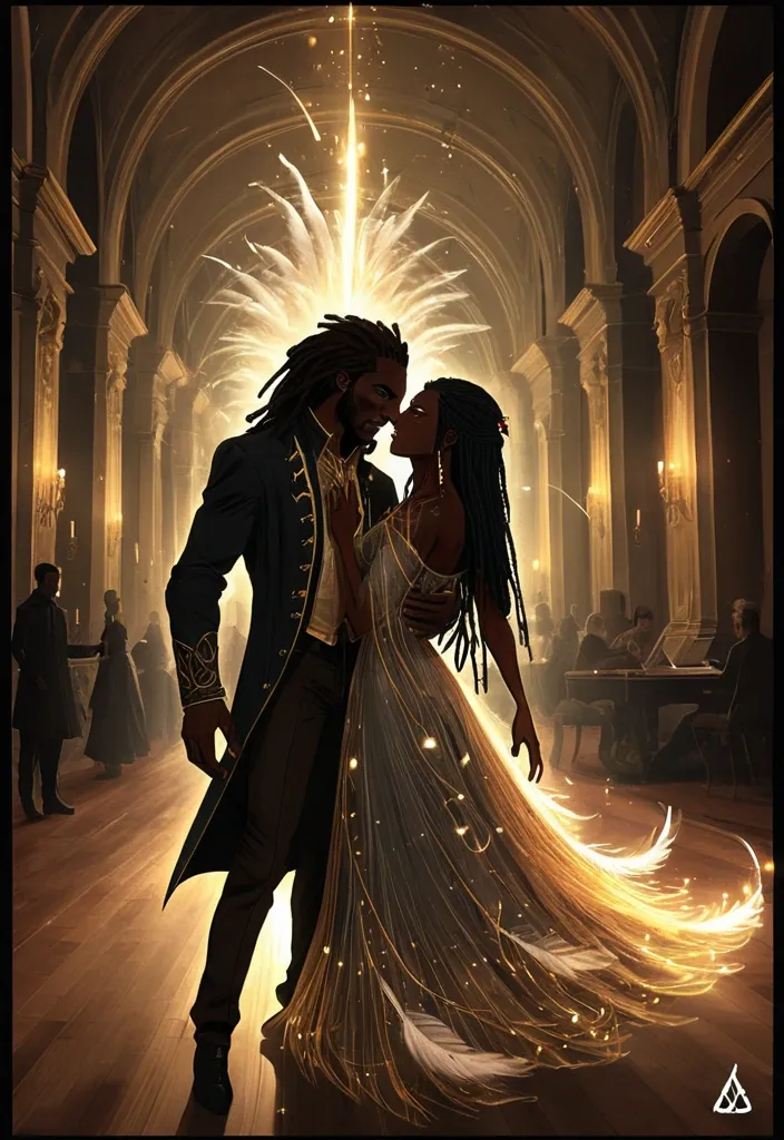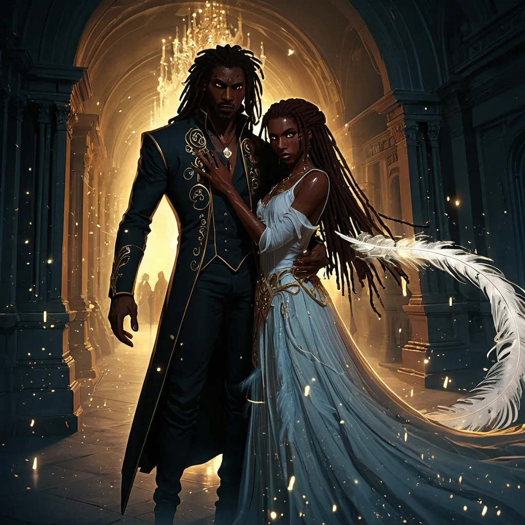 Aidan: Alfa lobisomem forte , elegante , imponente , 25-35 anos (cada era) , pele escura , dreadlocks , olhos penetrantes lupinos , olhar intenso , protetor , inspira respeito. Liaandra: Vampira esbelta , elegante , graciosa , 25-35 anos (cada era) , pele escura , dreadlocks longos escuros , olhos marcantes cativantes tom avermelhado , confiança silenciosa , sofisticação. 1: 1º Encontro (1905): Baile Viena luxuoso , olhares cruzam , Liaandra (vestido deslumbrante) , Aidan (traje formal) , valsa. Detalhes: Salão opulento , vestidos elegantes. Cores: Dourados , vermelhos , brancos cremosos. ,