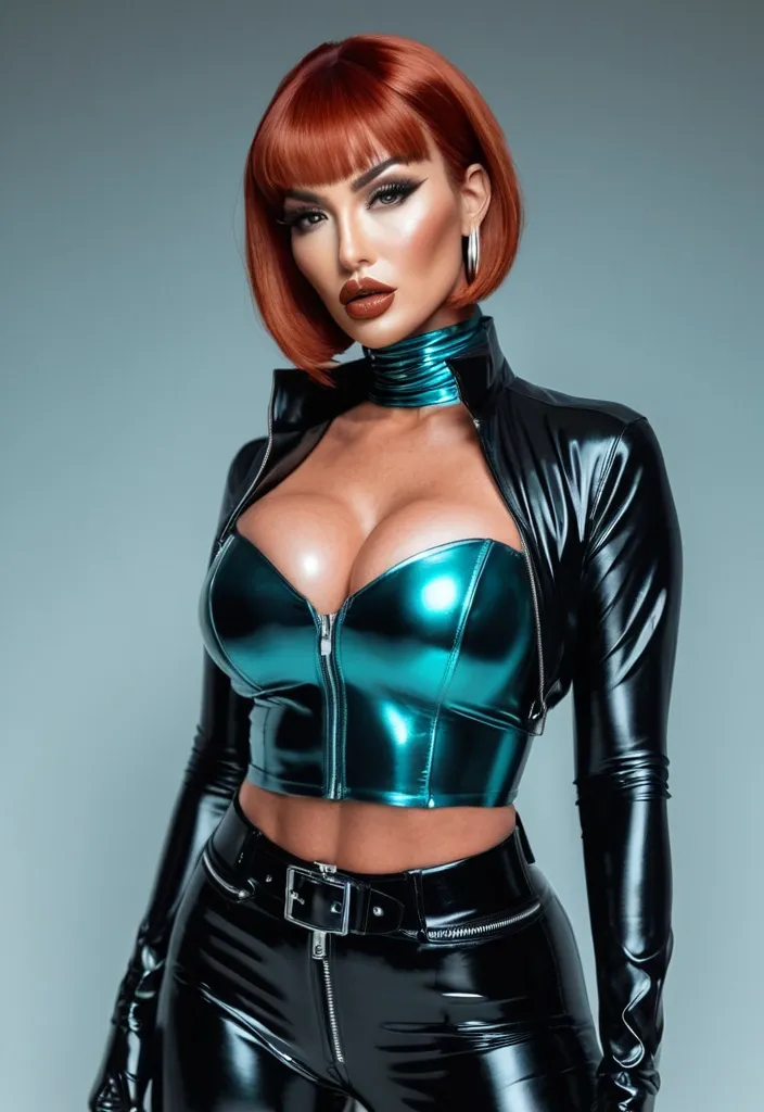 Generate Gorgeous female boss , Japanese woman , pointy face , bimbo , hourglass body , abnormally massive female bodybuilder , gorgeous , close up , full lips , big booty , red hair breast , bob-cut , bangs cover forhead design hair , feminine silhouette , too big breast , big booty , sexy thighs abs , silhouette , up close , flexing biceps , beautiful green eyes , legs are iconic and defining physical feature , both visually and in terms of combat ability.wearing an outfit that is a striking blend of elegance , power , and femininity , designed to command attention in any room. The suit is tailored to perfection , hugging the wearer’s curves with precision while emphasizing a structured silhouette. The fabric itself is a refined grey tweed patterned with subtle white grid lines , giving the suit a texture that feels both sophisticated and modern. The blazer features broad blue lapels and gold button accents , adding a luxurious touch that elevates the look beyond typical business attire. The matching high-waisted trousers elongate the frame , further enhancing the poised and commanding effect of the ensemble.The styling choices amplify the boldness of the suit. The inner blouse is a silky , greybutton-down shirt that complements the tweed’s tone while introducing a softer , feminine balance to the sharp tailoring of the jacket. The blouse peeks out neatly from under the blazer , maintaining elegance without drawing focus away from the suit’s commanding cut. Accessories are kept minimal yet intentional: a delicate layered gold necklace and hoop earrings that add glimmers of light and luxury without overpowering the outfit. The choice oframes the face with both confidence and glamour , completing the commanding visual.Altogether , this look communicates a blend of authority and allure. It is business-ready yet fashion-forward , balancing corporate structure with vibrant femininity. The color palette blue , grey and gold avoids being overly delicate , instead embracing the richness of texture , structure , and presence. This is the kind of ensemble that speaks to ambition , sophistication , and personal style—ideal for someone who thrives in positions of influence but insists on expressing her individuality with bold elegance. It’s not just clothing—it’s a statement of power wrapped in grace. In luxury living legs that could crush a watermelon , skirt high boots are a bold and striking statement piece , crafted in glossy black patent leather that gives them a sleek , polished finish. Rising to just below the knee , the boots feature three adjustable buckle straps along the shaft , adding both edge and detail to their design. The towering stiletto heel , paired with a thick platform sole , creates an ultra-dramatic silhouette that elongates the leg and exudes power and confidence. With their combination of shine , height , and structure , these boots perfectly balance fierce femininity with high-fashion allure. Gorgeous brown eyes , nose ring , big lips glossy lips , enormous breast , enormous butt She’s wearing a fitted blue leather futuristic -style jacket over a low-cut white top , paired with high-waisted brown pants , long black gloves , and a belt that pulls the whole bold , commanding look together. Enormous butt , enormous breast , modest turtleneck top She is wearing a tight , glossy black leather biker jacket left open over a tiny light-aqua cropped tank top that strains against her chest , paired with high-waisted , shiny black leather pants that hug every curve , creating a bold , bad-girl look under the moonlight. She is wearing a tight , glossy black leather biker jacket left open over a tiny light-aqua cropped tank top that strains against her chest , paired with high-waisted , shiny black leather pants that hug every curve , creating a bold , bad-girl look under the moonlight. Futuristic short Bob hair- cut ,
